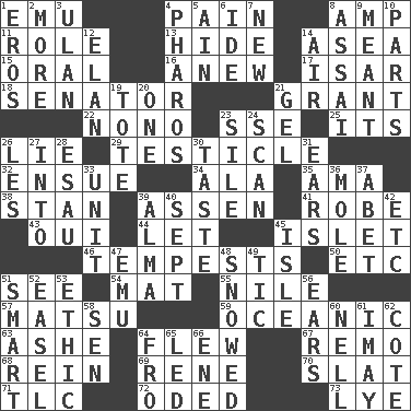 ACROSS 1. Australian flightless bird 4. Ache 8. Electrical Unit 11. Hero or heavy, e.g. 13. Flintstone garb 14. Toward the sea 15. Taken by mouth 16. Afresh 17. Astrian river, tributary to the Danube 18. Legislator 21. Monetary aid 22. Words to Nanette 23. Compass dir. 25. ___ a Wonderful Life 26. Whopper 29. A testis 32. Follow as a consequence or result 34. In the manner of 35. Nursemaid (var.) 38. Comedian Laurel of Laurel & Hardy 39. NE Netherlands city 41. Loose flowing garment 43. Fr. "Yes" 44. Allow 45. Small island 46. Storms 50. And so on (abbr.) 51. Perceive with the eye 54. Floor protector 55. The longest river in the world 57. Taiwanese island in East China Sea 59. Pertaining to the sea 63. American tennis player Robert 64. Soared 67. San ____ (Riviera town) 68. It's straight from the horse's mouth 69. French philosopher Descartes 70. Narrow board 71. Affectionate concern, for short 72. Wrote a lyric poem 73. Sodium hydroxide DOWN 1. Greek god of love 2. Greater amount 3. ____ Bator, Mongolia 4. N Egypt peninsula 5. The 18th letter of the Arabic alphabet 6. Binary compound 7. ___ Haven, CT 8. Slender Brazilian palm 9. Intended 10. Actors' quests 12. Style 14. Wind 19. Lug 20. Single 21. Set 23. Filth; sediment 24. Skim 26. French article 27. To the inside or interior of 28. He sold his birthright 30. Clothes sense 31. Hearing organs 33. A single undivided whole 36. Undercover agent 37. Collude with 39. _ mater 40. Back-to-school mo. 42. And so on (abbr.) 45. Capri or Wright 47. Australian flightless bird 48. Frozen precipiation fell 49. Nervous spasm 51. Don Adams' spy role 52. Artist's stand 53. Moral principle 56. Hearing organs 58. Elected rep. 60. 1994 drama film starring Jodie Foster 61. "If ____ say so..." 62. ____ d'Azur (French Riviera) 64. From 65. Directed 66. Compass dir.