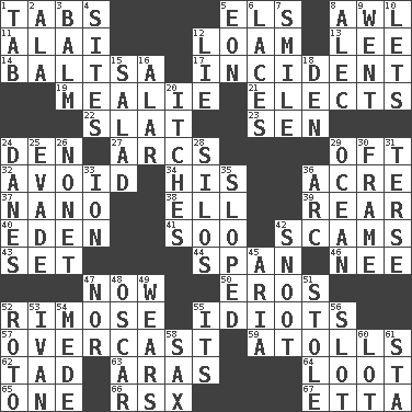 ACROSS 1. Bar bills 5. Raised railways 8. Leather borer 11. Jai _ 12. Rich soil 13. Area sheltered from the wind 14. Greek mezzo-soprano Agnes 17. Happening 19. Ear of corn 21. Chooses 22. Narrow board 23. Elected rep. 24. Lair 27. Arches 29. Often (poetically) 32. Stay clear from 34. Part of HMS, perhaps 36. Land measure 37. Billionth: prefix 38. Pipe bend 39. Buttocks 40. Locale of original sin 41. "Barney Miller" actor Jack 42. Fraudulent business schemes 43. Put into a specified state 44. Connect, as a bridge 46. Born 47. Immediately 50. Greek god of love 52. Full of chinks, cracks, or crevices 55. Foolish or stupid persons 57. Cloudy 59. Ringlike coral islands and reefs 62. Small boy 63. Ancient river in northeast Turkey 64. Plunder 65. Single 66. Acura sports coupe 67. Singer James DOWN 1. Keyboard key 2. Chicken ___ king 3. Lip ointment 4. Settings 5. Age 6. Shoestrings 7. Grin 8. Actor Baldwin 9. Left 10. Allows 12. Untruth 15. Vegetable dish 16. Having or resembling wings 18. Lair 20. Irritating cutaneous sensations 24. Natives or inhabitants of Denmark 25. Dodge 26. Music written for nine 28. Grain storage towers 29. Sea 30. Movie unit 31. Laconic 33. Electrically charged atom 35. Inclined 36. Curve 42. Snob 45. Operatic vocal solo 47. Not either 48. Motion picture award 49. Puts on (as clothing) 51. Fur scarf 52. Printing process, for short 53. _ the terrible 54. Ancient Persian 55. ___ a Wonderful Life 56. Slit 58. Saxophone 60. Car dealer's back yard 61. R.R. building