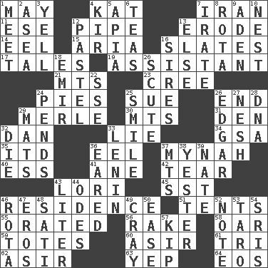 ACROSS 1. Fifth month 4. Krazy ___ of comics 7. SW Asia republic 11. Compass dir. 12. Corncob 13. Wear away 14. Snakelike fish 15. Roberta Peters solo 16. Chalkboards 17. Lies 19. Helper 21. Mountains (abbr.) 23. Algonquian 24. Sliced desserts 25. Institute legal proceedings 26. Conclude 29. Haggard of country music 30. Mountains (abbr.) 31. Lair 32. One of the 12 tribes of Israel 33. Untruth 34. Girls' org. (abbr.) 35. It would 36. Snakelike fish 37. Non-adult bird? 40. Curvy letter 41. One (Scot) 42. Rend 43. Australian parrot (variant) 45. Fast jet (abbr.) 46. Home 51. Portable shelters 55. Declaimed 56. Immoral or dissolute person 58. Rowing implement 59. Hauls 60. SW Saudi Arabia district 61. Three (prefix) 62. SW Saudi Arabia district 63. Slangy assent 64. Greek goddess of the dawn DOWN 1. Rendezvous 2. Toward the sea 3. Shout 4. Apertif with cassis 5. Capital of Western Samoa 6. Beverages made from leaves 7. Feeling or showing extreme anger 8. Round or rotation of duties 9. Arabian gulf 10. A home for chicks 12. Soft color 13. Otherwise 16. Fathers 18. Independent ruler or chieftain 20. Snake scale 22. Compass dir. 24. Depends 25. Grin 26. _ Allan Poe 27. Soft 28. Heredity factor (abbr.) 29. Floor coverings 32. Expire 33. Soviet premier 1918-24 36. Having ears or earlike features 37. Mountains (abbr.) 38. Of or pertaining to yesterday 39. Nathan's nickname 43. 61 cubic inches 44. Lyric poems 46. Round or rotation of duties 47. Greek god of love 48. Suttee (variant) 49. Supercomputer manufacturer 50. Comfort 52. Musical sound 53. Pacific island yam 54. Indian titles of respect 57. Monetary unit of Laos