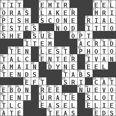 ACROSS 1. Teat (slang) 4. Independent ruler or chieftain 8. Snakelike fish 11. Mouths or openings 13. Member of a famous L.A. basketball team 15. Medical imaging device (abbr.) 16. Expression of disdain 17. Biscuitlike quick bread 18. Monetary unit of Yemen 19. _____ Park, CO 21. Lower and raise head in agreement 22. "Tell ____ the Marines!" 23. A female animal or person 24. Institute legal proceedings 27. Choose 29. Detail 30. Sour-tasting 34. Nine, plus one 36. For fear that 39. Picture 40. Baby powder 41. Keyboard key 43. "Terrible" tsar 44. At full speed 46. Unit of force 47. Snakelike fish 48. Is inclined (to) 49. Bar bills 51. Lizard (obsolete) 53. Indian title of respect (Mr.) 54. Domesticated feline 57. Inky black, to poets 60. To riddle 63. New (sp.) 65. Portable shelter 66. A salt of uric acid 69. Position in a hierarchy or organization 70. Affectionate concern, for short 71. Artist's stand 72. Writer Wiesel 73. Had dinner 74. Beverages made from leaves 75. Begley and Asner DOWN 1. Drinks excessively 2. From or relating to Ireland 3. Clothes sense 4. Raised railways 5. Big _ 6. Visual representation of an object 7. Former U.S. Attorney General Janet 8. Give off 9. Part of Q.E.F. 10. _ and Stitch 12. A female animal or person 14. Redecorate 18. Actors Guy, Robert Welles, and Clint 20. Fast jet (abbr.) 25. Ubangi River tributary 26. Make improvements or corrections to 28. Infant food 29. Happening 31. Be footloose 32. Slanted text style (abbr.) 33. Spanish title 34. Not wild 35. Flair 37. Filthy place 38. Portable shelters 40. Make lace 42. Hitchcock's "____ Window" 45. Science/research agcy. 50. Storage container 52. Loyal 54. Cell (Danish) 55. Keep away from 56. Hauls 57. Singer James 58. Waist strap 59. Single time 61. Part of Q.E.F. 62. Relaxation 64. Purpose 67. Beverage made from leaves 68. Raised railways