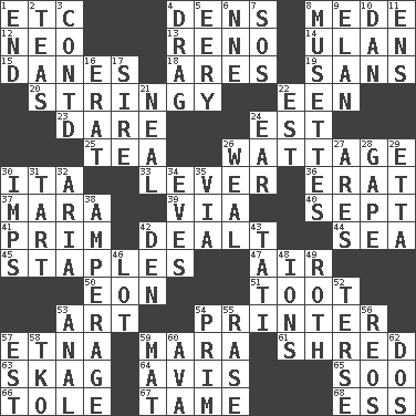 ACROSS 1. And so on (abbr.) 4. Habitations of wild animals 8. Ancient Persian 12. Modern: prefix 13. Former U.S. Attorney General Janet 14. ____ Bator, Mongolia 15. Natives or inhabitants of Denmark 18. Ancient Greek god of war 19. Without 20. Slender, wiry 22. Car or cant ending 23. Have the gumption 24. Eastern Standard Time (abbr.) 25. Afternoon social gathering 26. Electrical Measurement 30. Call ___ day 33. Prying instrument 36. Part of Q.E.F. 37. Hindu Mythology: god of death 39. By way of 40. Back-to-school mo. 41. Demure 42. Started a card game 44. Ocean 45. Paper fasteners 47. Atmosphere 50. Age 51. A blast of a horn 53. Tate display 54. Hard copy producer 57. Inactive volcano in Sicily 59. Hindu Mythology: god of death 61. Tear up 63. Heroin 64. Opinion 65. "Barney Miller" actor Jack 66. Lacquered or enameled metalware 67. Docile 68. Double-curved letter DOWN 1. Conclude 2. Beverages made from leaves 3. Continued (abbr.) 4. To draw with force 5. Suggestive of the supernatural 6. Compass dir. 7. Distress signal 8. French bagpipes 9. Style 10. One of the 12 tribes of Israel 11. Followers of ems 16. Part of Q.E.F. 17. Male parent of an animal 21. Actress Patricia 22. Eastern Standard Time (abbr.) 24. Ewer handle 26. Welt 27. Ancient Greek god of war 28. Yawn 29. Singer James 30. Naughty children 31. Small pie 32. Roberta Peters solo 34. Nights before holidays 35. By way of 38. Electrical Measurement 42. Lair 43. Jacques of French films 46. Car dealer's back yard 48. Charged atoms 49. Writer of Portnoy's Complaint (1969) 52. Laconic 53. Of or related to the anus 54. Demure 55. Raze (variant) 56. Vintage cars 57. Eastern Standard Time (abbr.) 58. Ring climax 59. Floor protector 60. Actress Gardner 62. Two (Sp.)