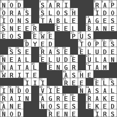 ACROSS 1. Allow head to fall sleepily 4. Indian skirt 8. Reproach for some lapse or misdeed 11. Mouths or openings 13. Make a splashing sound 15. Wedding promise 16. Charged particles 17. Eating place 18. Ripens 19. Contemptuous expression 21. Snakelike fish 22. Object of repulsion 23. Greek goddess of the dawn 24. She-sheep 27. Purulenc 29. Colored 30. Drinks excessively 34. Compass dir. 36. Raze (variant) 39. Evade 40. Actress Patricia 41. Dodge 43. ____ Bator, Mongolia 44. Brizilian seaport 46. Engineer (abbr.) 47. Scottish cap 48. Compose 49. American tennis player Robert 51. One more than two 53. Portuguese money of account (variant) 54. Raised railways 57. Southeast Asian peninsula 60. Compete 63. Relating to the nose 65. Precipitation 66. Match 69. Immoral or dissolute person 70. A saturated hydrocarbon 71. Olfactory organs 72. Supplemented with great effort 73. Allow head to fall sleepily 74. French philosopher Descartes 75. Big collection agency DOWN 1. Annoying sound 2. U. of Maine site 3. Natives or inhabitants of Denmark 4. Fast jet (abbr.) 5. Wing 6. Loose flowing garment 7. Capri or Wright 8. Port city in Latvia 9. Arabian gulf 10. Introduce or present, as a question 12. Compass dir. 14. Assist 18. Utter; complete 20. Marina Del _, California 25. Past tense of be (plural) 26. Peak District village in England 28. Shoshoni 29. Conveyance 31. Monetary unit of Botswana 32. Dutch treat 33. Elected rep. 34. Shrivel 35. Suttee (variant) 37. Player for Phoenix 38. _ Allan Poe 40. Compass dir. 42. Celtic language 45. Luau accessory 50. Layer 52. _ the terrible 54. 1973 Nobel Price Winner (Physics) Leo 55. Member of a famous L.A. basketball team 56. Bobsleighs 57. SW Asia republic 58. Billionth: prefix 59. Passed on 61. Russian composer Stravinsky 62. Celtic language 64. "We ___ not amused" (Victoria) 67. Car or cant ending 68. Compass dir.