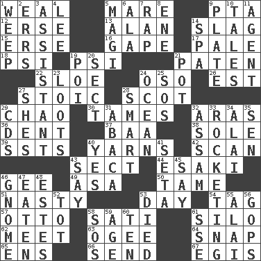 ACROSS 1. Welt 5. Female horse 9. Parent Teacher Association (abbr.) 12. Celtic language 13. Actor Alda or Thicke 14. Volcanic refuse 15. Celtic language 16. Stare wonderingly 17. Light colored 18. 23rd letter of the Greek alphabet 19. Air pressure measure (abbr.) 21. Eucharist need 22. _ gin 24. Bear (Spanish) 26. Eastern Standard Time (abbr.) 27. Unemotional 28. Highlander 29. US Secretary of Labor Elaine L. _ 30. Domesticates 32. Ancient river in northeast Turkey 36. Scratch 37. Sound made by sheep 38. Not divided or shared with others 39. Fast planes 40. Entertaining tales 42. Examine minutely or intensely 43. Religious group 44. 1973 Nobel Price Winner (Physics) Leo 46. Unit of force equal to gravity 49. White ___ sheet 50. Docile 51. Thoroughly unpleasant 53. 24 hours 54. Label 57. "Beetle Bailey" pooch 58. Suttee (variant) 61. Grain storage tower 62. Confront 63. Double curve, resembling the letter S 64. Fastener 65. Followers of ems 66. Transmit 67. Armor plate that protects the chest DOWN 1. Shed a tear 2. Blunders 3. Aide 4. Area sheltered from the wind 5. Wise men 6. Insect wing 7. Reproach for some lapse or misdeed 8. Compass dir. 9. Food holder 10. Falsehoods 11. Representative 14. Health resort 19. Luau course 20. Religious group 21. Cooking vessel 23. Plunders 24. Sea 25. Distress signal 27. "______ My Girl" (Turtles hit) 28. Don Adams' spy role 29. Music discs 31. Phillipine bananalike plant 32. Indian state 33. Shooting up abruptly 34. Mountain range southwest of Kyrgyzstan 35. Elected rep. 40. Affirmative reply 41. Bristle 43. Declare 45. Declare 46. Dwarf 47. Eroded 48. _____ Park, CO 52. Small child 53. Passed on 55. Jai _ 56. Republicans 58. Mayday 59. Ripen 60. "___ Little Indians" 61. Compass dir.