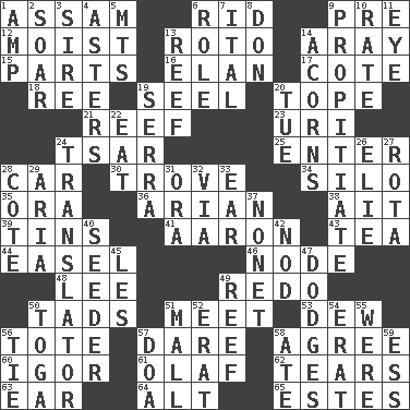 ACROSS 1. Indian state 6. To free from 9. Before (prefix) 12. Wet 13. Printing process, for short 14. Like ___ of sunshine 15. Pieces 16. Style 17. ____ d'Azur (French Riviera) 18. Portuguese money of account (variant) 19. Sew up the eyelids of hawks and falcons 20. Drink excessively 21. Coral ridge 23. RI univ. 24. Russian ruler of old 25. Keyboard key 28. 4-wheeled motor vehicle 30. Collection of objects 34. Grain storage tower 35. Mouth or opening 36. Believer in; advocate of (suffix) 38. Small island 39. Canisters 41. Composer Copland 43. Afternoon social gathering 44. Artist's stand 46. Connecting point 48. Area sheltered from the wind 49. Redecorate 50. Bits 51. Confront 53. Morning condensation 56. Lug 57. Have the gumption 58. Match 60. Composer Stravinsky 61. Norwegian king 62. Separates forcefully 63. Ewer handle 64. The first octave above the treble staff 65. _____ Park, CO DOWN 1. Electrical Unit 2. Fly high 3. Father 4. Michaelmas daisies 5. Mountains (abbr.) 6. Hero or heavy, e.g. 7. Slanted text style (abbr.) 8. Spanish title 9. Conciliate 10. Assign a rank or rating to 11. Sight organ 13. Coral ridge 14. Oak nuts 19. Father Junipero _ 20. Third day of the wk. 22. Erode 24. Interpreter 26. Writer Wiesel 27. Roll call or roster of names 28. ____ d'Azur (French Riviera) 29. Roberta Peters solo 31. Mouth or opening 32. By way of 33. Ewer handle 37. Music written for nine 40. Sowing specialist 42. Allow head to fall sleepily 45. French article 47. Evades 49. Coral collection 50. Ancient Roman robe 51. Promenade 52. Part of Q.E.F. 54. Part of Q.E.F. 55. Past tense of be (plural) 56. Make a knot 57. ___ good deed 58. Had dinner 59. Double-curved letter