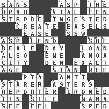ACROSS 1. Without 5. Cleo's killer 8. Definite Article 11. Brightly colored fish 12. Small bottle 13. Car or cant ending 14. Disco prop 17. Eaten 19. Cause to be 21. Artist's stands 22. Relaxation 23. Compass dir. 24. Viper 27. Grant temporary use of 29. A female animal or person 32. Memphis, Tenn. Street 34. 24 hours 36. Grant temporary use of 37. In addition 38. Compass dir. 39. Small Philippine buffalo 40. Municipality 41. Lair 42. Glorify 43. Personal question 44. Comedian Laurel of Laurel & Hardy 46. Portuguese money of account (variant) 47. Parent Teacher Assoc. 50. Against 52. A viewer who gazes fixedly 55. Michaelmas daisies 57. News announcer 59. Pressed 62. It is 63. Filth; sediment 64. Nanny 65. Observe 66. Snakelike fish 67. Hurried DOWN 1. Distress signal 2. Fitting 3. Drug cop 4. Dinah or Pauly 5. The 18th letter of the Arabic alphabet 6. Gurus 7. Entreaties 8. False hair 9. Person who is morally reprehensible 10. Conclusions 12. Compete 15. Calif. Air Force Base 16. Comfort 18. Compass dir. 20. Looked after 24. Phillipine bananalike plant 25. Major League Baseball Commissioner Bud 26. Thick mixture 28. Natives or inhabitants of Denmark 29. Underwater navigation system 30. White Person, in Hawaii 31. Related on the mother's side 33. Myrna of the movies 35. Gossips 36. Not strict 42. Keyboard key 45. Opposed to 47. Adept person 48. Laconic 49. Nick name for Arthur 51. Metal shackles 52. Indian titles of respect 53. Wig 54. Domed church section 55. "We ___ not amused" (Victoria) 56. Fastener 58. Pipe bend 60. Compass dir. 61. Male parent