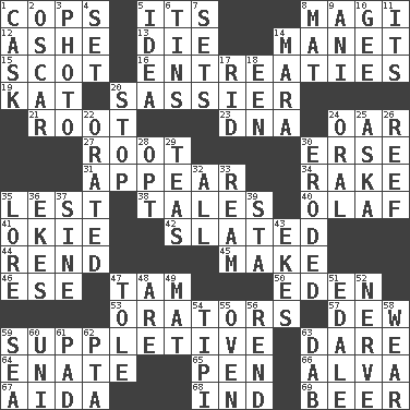 ACROSS 1. 911 reaches them 5. ___ a Wonderful Life 8. Wise men 12. American tennis player Robert 13. Expire 14. French painter Edouard 15. Native of Scotland 16. Pleas 19. Krazy ___ of comics 20. More impudent 21. Carrot, for example 23. Heredity factor (abbr.) 24. Rowing implement 27. Carrot, for example 30. Celtic language 31. Become visible 34. Immoral or dissolute person 35. For fear that 38. Stories 40. Norwegian king 41. Migrant worker of the '30s 42. Scheduled 44. Tear apart 45. Create 46. Compass dir. 47. Scottish cap 50. Paradise 53. Speakers 57. Morning condensation 59. Supplementary 63. Have the gumption 64. Maternal 65. Fenced enclosure 66. Inventor's middle name 67. Opera by Verdi 68. Working for oneself (abbr.) 69. Fermented drink made from hops DOWN 1. Keg 2. Motion picture award 3. Picture 4. Put into a specified state 5. The main thing one is thinking about 6. Canisters 7. Arranges properly for use 8. Floor covering 9. Black tropical American cuckoo 10. Unit of force equal to gravity 11. It is 14. Hindu Mythology: god of death 17. To free from 18. Car or cant ending 20. Close up, plug up 22. Spoke pompously 24. Of the mouth 25. "____ silly question..." 26. Coral collection 28. Elect 29. Beverages made from leaves 30. Worn away 32. 100% 33. 480, 500 or 516 sheets of paper 35. Old wives' tales, e.g. 36. Supplements with great effort 37. Trig term 39. R.R. building 43. Supplements with great effort 47. Lacquered or enameled metalware 48. "We ___ not amused" (Victoria) 49. Floor protector 51. Peak District village in England 52. Effrontery 54. Native american tent (variation) 55. Baking chamber 56. Tear apart 58. Put on (as clothing) 59. Ocean 60. Single; one (prefix) 61. Groovy apt. 62. Parent Teacher Association (abbr.) 63. Apply (a substance) by light strokes
