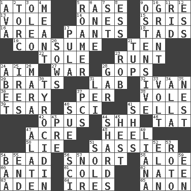ACROSS 1. Tiny particle 5. To erase 9. Legendary monster 13. Grand slam 14. Singles 15. Indian titles of respect 16. Length times width 17. Leg coverings 18. Small boys 19. Eat 21. "___ Little Indians" 22. Lacquered or enameled metalware 23. The smallest animal of a litter 24. Direct toward a target or goal 27. Armed conflict 28. Republicans 29. Naughty children 31. Experiment locale 32. "Terrible" tsar 36. Suggestive of the supernatural 37. For each 38. Grand slam 39. Russian ruler of old 40. _-fi 41. Exchanges for money 42. Musical composition 44. Quiet! 46. Make lace 47. 1/640 square mile 48. Person who is morally reprehensible 50. Falsehood 51. More lively and spirited 54. Necklace unit 56. Derisive sound 58. Medicinal plant 60. Opposed to 61. Having a low temperature 62. Nathan's nickname 63. An important port of Yemen 64. Angers 65. Soon (poet.) DOWN 1. Actress Gardner 2. Torque (variant) 3. Margarine 4. Intended 5. Wanderer 6. Queen of England 1702-14 7. Put into a specified state 8. Double-curved letter 9. Clearly or manifestly demonstrative 10. Monetary aid 11. To free from 12. Double-curved letter 17. Monetary unit of Botswana 20. Sty mamas 21. Uncastrated adult male sheep 23. Director Reiner 24. Collude with 25. Angers 26. Hindu Mythology: god of death 28. Slender fish 30. Polypeptide antibiotic 31. Flowery wreath 33. Electrical Unit 34. Silent film actress Nazimova 35. Egg locale 37. Personal Computers (abbr.) 40. Institute legal proceedings 41. "______ My Girl" (Turtles hit) 43. Before (prefix) 44. Broken pieces 45. Command 47. Having winglike extensions 49. Climbing, woody, usually tropical vines 51. Flatfish 52. Style 53. Printing process, for short 54. Sound made by sheep 55. Conclusion 56. _-fi 57. Not either 59. Car or cant ending