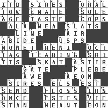 ACROSS 1. It would 4. Founders of families 9. Relating to the mouth 13. Pull behind 14. Related on the mother's side 15. Not divided or shared with others 16. Mature 17. Clothes sense 18. 911 reaches them 19. Insect wing 21. Teachers' org. 22. Narrow boards 24. Actor's bit 26. Atmosphere 27. Tolerate 29. United States Postal Service (abbr.) 30. Music written for nine 31. Painter Guido (1575-1642) 33. Sep. follower 36. Label 37. Pulling apart 40. Indian title of respect (Mr.) 41. It is 42. Three-handed card game 43. Moving or stirring 45. Yard entry 47. First-year military academy student 48. Deep reverence 49. Period of immesurable duration 50. Founders of families 52. Raised railways 54. Eastern Standard Time (abbr.) 56. Transmit 57. Soft thread for cleaning between teeth 59. Big collection agency 61. Single time 62. _____ Park, CO 63. Compete 64. Comedian Laurel of Laurel & Hardy 65. Intended 66. A really long time DOWN 1. Call ___ day 2. Ancient Roman robe 3. Residences 4. Put into a specified state 5. Empty; void 6. To erase 7. Singer James 8. Observe 9. Motion picture awards 10. Carrot, for example 11. High mountains 12. French article 20. Assistant 22. Indian antelope 23. Mouth edge 25. Remaining after all deductions 27. Opposed to 28. Water vessel 29. A single undivided whole 31. Libertine 32. Period 33. Clearly or manifestly demonstrative 34. Baby bed with high sides 35. Hoop that covers a wheel 38. _____ Park, CO 39. Yawn 44. _ gin 45. Place where plants grow 46. Deep reverence 49. NE Netherlands city 50. Posted 51. South American Indian 52. Otherwise 53. Globular water bottle used in Asia 55. Musical group of three 56. Distress signal 57. Opposite of masc. 58. Fast jet (abbr.) 60. Elected rep.