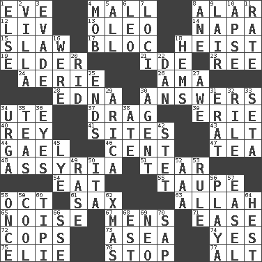 ACROSS 1. First lady 4. Promenade 8. Having or resembling wings 12. 54 in ancient Rome 13. Butter sub 14. California wine valley 15. Cole _ (cabbage dish) 17. Coalition 18. Robbery 19. A person who is older than you are 21. Binary compound 23. To sift 24. Nest on high 26. Nursemaid (var.) 28. Pulitzer Prize-winning author Ferber 30. Statements in reply to questions 34. Shoshoni 37. To draw with force 39. 4th largest of the Great Lakes 40. Marina Del _, California 41. Locates 43. The first octave above the treble staff 44. Highlander 46. Penny 47. Afternoon social gathering 48. Nineveh was its capital 51. Lacerate 54. Ingest 55. Grayish beige 58. Sep. follower 61. Saxophone 63. Assad's deity 65. Annoying sound 67. Not women's 71. Relaxation 72. 911 reaches them 73. Toward the sea 74. It is so 75. Writer Wiesel 76. Discontinue 77. The first octave above the treble staff DOWN 1. Otherwise 2. Country estate 3. Elude 4. Disorderly crowd 5. 100% 6. Lion 7. Locales 8. One (Scot) 9. Den 10. Domed church section 11. Pace 16. We are 18. Folds over and sews together 20. To free from 22. Daniel's nick name 25. Conclusions 27. Deep reverence 29. N. Chile seaport 30. Rep 31. Part of Q.E.F. 32. Cause heat under the collar 33. Bristle 34. Capital and largest city of Mongolia 35. Beverages made from leaves 36. Snake ____ (dice throw) 38. Had dinner 42. Proofreading order 45. Potassium hydroxide 49. To erase 50. Call ___ day 52. American Automobile Association (abbr.) 53. Governing power 56. Beach, in Buenos Aires 57. Artist's stand 58. At one time in the past 59. Calm and collected 60. Native american tent (variation) 62. Dec. holiday 64. Behest 66. Compass dir. 68. Eastern Standard Time (abbr.) 69. Modern: prefix 70. Plant excrement