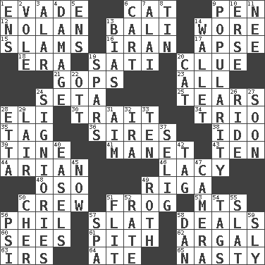 ACROSS 1. Elude 6. Feline 9. Fenced enclosure 12. Pitcher Ryan 13. Indonesian resort city 14. Had on 15. Shuts with force 16. SW Asia republic 17. Domed church section 18. Epoch 19. Suttee (variant) 20. A slight indication 21. Republicans 23. Everything 24. Bristle 25. Pulls into pieces 28. Connecticut Ivy Leaguer 30. Distinguishing feature 34. Musical group of three 35. Label 36. Male parents of animals 38. Wedding promise 39. Prong on a fork 41. French painter Edouard 43. "___ Little Indians" 44. Believer in; advocate of (suffix) 46. Made of lace 48. Bear (Spanish) 49. Port city in Latvia 50. Group working together 51. Tree-dwelling hopper 53. Mountains (abbr.) 56. Silvers or Donahue 57. Narrow board 58. Allots cards 60. Observes 61. Heart or essence 62. Therefore, facetiously 63. Big collection agency 64. Had dinner 65. Thoroughly unpleasant DOWN 1. Followers of ems 2. Short-tailed, large-bodied rat 3. Having or resembling wings 4. Break 5. Followers of ems 6. Heavy open wagon 7. Jai _ 8. Metal container 9. Teen's desire 10. Celtic language 11. Born 13. Prejudice 14. Place for singles 19. Practice fights 20. Domesticated feline 22. Baseball player Mel 24. Seigniories (variant) 26. Travel on an animal 27. Within a short period 28. Singer James 29. Den 31. Direct toward a target or goal 32. Lyricist Gershwin 33. Nine, plus one 37. Former Milwaukee Brewers owner Bud 40. Artist's stands 42. Label 45. At this time 47. Device for capturing images 49. Writer of Portnoy's Complaint (1969) 50. "Mermaids" star 51. Sudden quick movement 52. Pace 54. Labels 55. Narrow board 56. 23rd letter of the Greek alphabet 57. Health resort 58. Daniel's nick name 59. Insidious