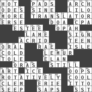 ACROSS 1. Being at a high temperature 4. Groovy apts. 8. Bowlike part 12. Lyric poems 14. Trig term 15. _ and Stitch 16. Greater amount 17. Interpreter 20. Celtic language 21. ___ good deed 22. Tax preparer (abbr.) 23. First name in cosmetics 27. Brightly colored fish 29. Unable to walk 31. Signal 34. Bitter 35. Adolescent 36. Of the mouth 39. Actress Charlotte 41. Capri or Wright 42. Chilled 43. Arboreal primate 46. Lacquered or enameled metalware 47. Enthusiasm 48. Mouths or openings 51. Free of sound 54. Nonscientific branch of learning 56. Frozen water 58. I made a mistake 61. Rotating or pertaining to rotation 66. Calm and collected 67. Clement's nick name 68. One of the Great Lakes 69. "Tell ____ the Marines!" 70. Ooze 71. Plant excrements 72. Fast jet (abbr.) DOWN 1. Dwelling 2. Scent 3. Laconic 4. Pacific Standard Time (abbr.) 5. Atmosphere 6. Heredity factor (abbr.) 7. Post 8. In the manner of 9. Actors Guy, Robert Welles, and Clint 10. Hoof sound 11. Israeli folk dance 13. Observes 18. "Barney Miller" actor Jack 19. Infant locale 24. Affectionate concern, for short 25. Ewer handle 26. Independent ruler or chieftain 28. Having gotten out of bed 30. Peak District village in England 32. Set 33. Compass dir. 34. Tree or shrub in the Birch family 36. Sep. follower 37. Friend of Pooh 38. One to whom something is allotted 40. Snakelike fish 44. Floor covering 45. Single; one (prefix) 49. Small island 50. _-fi 52. Locales 53. Plunders 54. Arches 55. Hero or heavy, e.g. 57. Nights before holidays 59. Plant holders 60. Narrow, elongated depression 62. Electrical Unit 63. Epoch 64. Mouth edge 65. Affirmative reply
