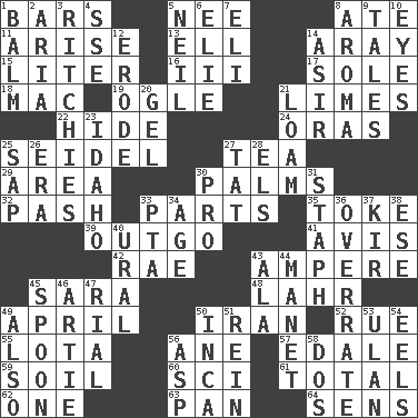 ACROSS 1. Long, evenly shaped pieces 5. Born 8. Had dinner 11. Ascend 13. Pipe bend 14. Like ___ of sunshine 15. 61 cubic inches 16. One more than two 17. Flatfish 18. Apple computer (short form) 19. Stare at amorously 21. Citrus fruits 22. Flintstone garb 24. Mouths or openings 25. A glass for beer 27. Afternoon social gathering 29. Length times width 30. Insides of hands 32. Romantic infatuation 33. Components 35. Casino tip 39. Outlay 41. Deliberation 42. Actress Charlotte 43. Electrical Unit 45. "Two Mules for Sister ____" 48. Cowardly lion portrayer 49. Showery time 50. SW Asia republic 52. Regret 55. Globular water bottle used in Asia 56. One (Scot) 57. Peak District village in England 59. Earth 60. _-fi 61. Add up to 62. Single 63. Baking dish 64. Elected reps. DOWN 1. Lip ointment 2. Roberta Peters solo 3. Actors Guy, Robert Welles, and Clint 4. Compass dir. 5. Famous astronaut Armstrong 6. Writer Wiesel 7. Connecticut Ivy Leaguer 8. Scent 9. Lies 10. Snake ____ (dice throw) 12. Wear away 14. SW Saudi Arabia district 20. Set 21. Rich soil 23. Potato state 25. Plant excrement 26. Period 27. Make lace 28. Raised railways 30. Adept person 31. Staphylococcus 33. Parent Teacher Assoc. 34. Grow older 36. Make much ado about nothing 37. Apertif with cassis 38. Compass dir. 40. Mountain range 43. In the manner of 44. French painter Edouard 45. Soup utensil 46. Nick name for Arthur 47. Monetary unit of Yemen 49. In addition 50. South American Indian 51. It's straight from the horse's mouth 53. ____ Bator, Mongolia 54. Snakelike fish 56. Cleo's killer 58. Two (Sp.)