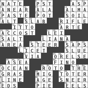 ACROSS 1. Nathan's nickname 5. Pacific Standard Time (abbr.) 8. Viper 11. Approach 13. In the manner of 14. _ mater 15. Thick mixture 16. Cooking vessel 17. Earth 18. Keyboard modifier key 19. Broad, flat, thick piece 21. Firearm 22. "Tell ____ the Marines!" 24. Johnson of "Laugh-In" 25. Buttonhole 27. Flowery wreath 29. Table seasoning 30. Climbing, woody, usually tropical vines 32. Type of rug 33. Navigate 35. Plant excrements 39. It is permitted: Lat. 41. Turn sharply 42. By way of 43. Threatening words 45. Toward the sea 48. Fine (Spanish) 49. Sea 50. Printing process, for short 52. Definite Article 55. Pate de foie ____ 56. Russian fighter aircraft 57. Carrier 59. Actor's bit 60. Ripen 61. Scornful expression 62. Begley and Asner 63. Sliced dessert 64. Snakelike fish DOWN 1. California wine valley 2. Of or related to the anus 3. One of the two male reproductive glands 4. Consume 5. Dad 6. Messy guy 7. Make lace 8. High up in or into the air 9. Grin 10. Diluted with white 12. Musical pauses 14. SW Saudi Arabia district 20. Car dealer's back yard 21. Water falling in drops from the sky 23. "_____ Recall" 25. White ___ sheet 26. Automobile 27. Whopper 28. Hearing organ 30. Allow 31. NE Netherlands city 33. _-fi 34. Afternoon social gathering 36. One to whom something is allotted 37. Purulenc 38. Perceive with the eye 40. "Terrible" tsar 43. Often (poetically) 44. Disturbances 45. Sour-tasting 46. Seines 47. Relaxation 49. Stare 50. Swiss mountan, "Queen of the Mountains" 51. Double curve, resembling the letter S 53. The bottom of a shoe or boot 54. Blunders 56. Atlas unit 58. Single