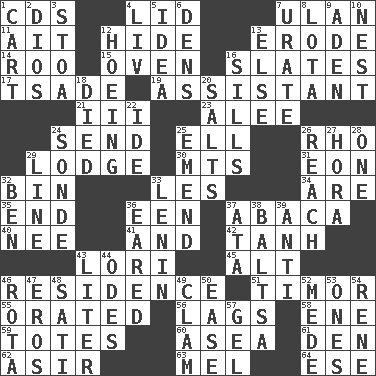 ACROSS 1. Music discs 4. Flaplike covering 7. ____ Bator 11. Small island 12. Flintstone garb 13. Eat (away) 14. Friend of Pooh 15. Baking chamber 16. Chalkboards 17. Sadhe (variant) 19. Helper 21. One more than two 23. Toward shelter 24. Transmit 25. Pipe bend 26. 17th letter of the Greek alphabet 29. Inn 30. Mountains (abbr.) 31. Age 32. Storage container 33. French article 34. "We ___ not amused" (Victoria) 35. Conclusion 36. Car or cant ending 37. Phillipine bananalike plant 40. Born 41. Also 42. Hyperbolic tangent 43. Australian parrot (variant) 45. The first octave above the treble staff 46. Dwelling 51. The easternmost of the Lesser Sundas 55. Declaimed 56. Fails to keep up a pace 58. Compass dir. 59. Hauls 60. At sea 61. Lair 62. SW Saudi Arabia district 63. Cartoonist voice _ Blanc 64. Compass dir. DOWN 1. Heavy open wagon 2. "Vaya con ____" 3. Portico 4. 54 in ancient Rome 5. The content of cognition 6. Hiding places for outlaws 7. A salt of uric acid 8. Globular water bottle used in Asia 9. Arabian gulf 10. A home for chicks 12. Weeding 13. Otherwise 16. Beverly of Met fame 18. Passed on 20. Table seasonings 22. Binary compound 24. Message 25. Make improvements or corrections to 26. Arrive at 27. Israeli folk dance 28. Single 29. Actor's bit 32. Benjamin's nick name 33. Soviet premier 1918-24 36. Having ears or earlike features 37. "One Day ___ Time" 38. Greek mezzo-soprano Agnes 39. Against 43. 61 cubic inches 44. Lyric poems 46. Round or rotation of duties 47. Greek god of love 48. Suttee (variant) 49. Dollar (slang) 50. Comfort 52. Ancient Persian 53. Singles 54. French philosopher Descartes 57. Set