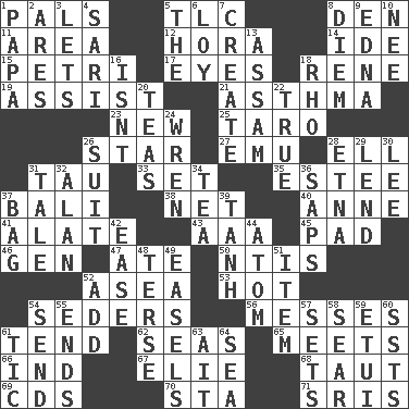 ACROSS 1. Friends 5. Affectionate concern, for short 8. Lair 11. Length times width 12. Israeli folk dance 14. Binary compound 15. _ dish (used to culture cells) 17. Sight organs 18. French philosopher Descartes 19. Help 21. Respiratory problem 23. ___ Haven, CT 25. Pacific island yam 26. Play the lead 27. Australian flightless bird 28. Pipe bend 31. The 19th letter of the Greek alphabet 33. Arrange properly for use 35. First name in cosmetics 37. Indonesian resort city 38. Fish or hair follower 40. Singer Murray 41. Having winglike extensions 43. American Automobile Association (abbr.) 45. Groovy apt. 46. Commissioned mil. rank 47. Had dinner 50. Nuclear Threat Initiatives 52. At sea 53. Being at a high temperature 54. Spring feasts 56. Makes clutter 61. Look after 62. Oceans 65. Confronts 66. Indiana (abbr.) 67. Writer Wiesel 68. Strained 69. Music discs 70. R.R. building 71. Indian titles of respect DOWN 1. Dad 2. Ancient Greek god of war 3. Allows 4. Indian skirt 5. Definite Article 6. Myrna of the movies 7. Cause to be 8. South Vietnam president (1954) 9. Pulitzer Prize-winning author Ferber 10. Born 13. Indian state 16. Is not 18. 17th letter of the Greek alphabet 20. Afternoon social gatherings 22. Loyal 24. Songbird 26. Costume for a special activity 28. Inactive volcano in Sicily 29. Grant temporary use of 30. Area sheltered from the wind 31. Falsehood 32. Actor Alda or Thicke 34. Afternoon social gathering 36. Plant excrements 37. Paper or plastic container 39. Hyperbolic tangent 42. Comfort 44. Smallest unit of an element 48. Laconic 49. Artist's stands 51. A whole individual unit 52. Say or write further 54. Post 55. Extremities 57. Puts into a specified state 58. Burn superficially 59. Needle holder 60. Fast planes 61. Nervous spasm 63. Small island 64. Ocean