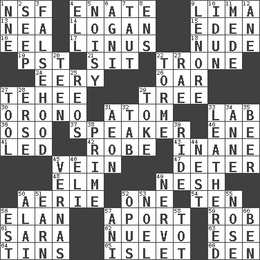 ACROSS 1. Science/research agcy. 4. Related on the mother's side 9. Pale green bean 13. Teachers' org. 14. Utah city north of Ogden 15. Paradise 16. Snakelike fish 17. "_ and Lucy" (Charlie Brown theme song) 18. Unadorned 19. Pacific Standard Time (abbr.) 21. Be seated 22. Heavy duty weighing machine 24. Suggestive of the supernatural 26. Boat paddle 27. Giggle 29. Relationship diagram 30. U. of Maine site 31. Smallest unit of an element 33. Experiment locale 36. Bear (Spanish) 37. Orator 40. Compass dir. 41. Directed 42. Loose flowing garment 43. Empty; void 45. Distinctive style or manner 47. Prevent from occurring 48. Shade tree 49. Delicate 50. Nest on high 52. Single 54. Nine, plus one 56. Liveliness 57. To the left, to Queeg 59. Director Reiner 61. "Two Mules for Sister ____" 62. New (sp.) 63. Compass dir. 64. Airtight sealed metal containers 65. Small island 66. Lair DOWN 1. Compass dir. 2. Ooze 3. It jiggles the polygraph 4. Pipe bend 5. Annoyingly loud 6. Hindu god of fire 7. Tense 8. Followers of ems 9. Poe poem 10. Goddess of spring and wife of Bragi 11. Ancient Persian 12. One (Scot) 20. Adolescent 22. Singer Mel 23. Actress Charlotte 25. Vintage cars 27. Implement 28. Celtic language 29. Casino tip 31. Period of immesurable duration 32. Bar bill 33. Resembling or made to resemble leather 34. Singer Murray 35. Fermented drink made from hops 38. A-one 39. Travel on an animal 44. Egg locale 45. Actresses Bloom and Felton 46. Connecticut Ivy Leaguer 49. Impudent aggressiveness 50. Jai _ 51. Merit 52. Musical composition 53. Christmas carol 55. Characteristic smell of wine 56. Eastern Standard Time (abbr.) 57. Black tropical American cuckoo 58. Small child 60. Benjamin's nick name