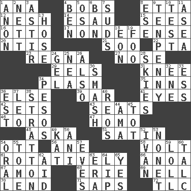 ACROSS 1. Santa ___, CA 4. Moves up and down 8. Singer James 12. Tender 14. He sold his birthright 15. Observes 16. "Beetle Bailey" pooch 17. Unrelated to defense, as in spending 20. Nuclear Threat Initiatives 21. "Barney Miller" actor Jack 22. Parent Teacher Assoc. 23. Canadian anthropologist Darnell 27. Olfactory organ 29. Snakelike fish 31. Leg joint 34. Suffix with ecto or cyto 35. Lodging establishments 36. Otherwise 39. Boat paddle 41. Snake ____ (dice throw) 42. Arranges properly for use 43. Theater features 46. "Corrida" creature 47. Like (prefix) 48. "____ silly question..." 51. Smooth fabric 54. Baseball player Mel 56. A saturated hydrocarbon 58. Electrical Unit 61. Happening in regular succession 66. Small Philippine buffalo 67. Mine, in Marseilles 68. 4th largest of the Great Lakes 69. 1994 drama film starring Jodie Foster 70. Grant temporary use of 71. Plant excrements 72. Affectionate concern, for short DOWN 1. Soon (poet.) 2. Remaining after all deductions 3. Moving about 4. Benjamin's nick name 5. Bear (Spanish) 6. Bar 7. Beer foam 8. Compass dir. 9. 3-inch nail 10. Trial 11. Toward the sea 13. Stockings 18. Age 19. Egg _ yung 24. Set 25. Teachers' org. 26. In addition 28. Atmospheres 30. Box-office sellout 32. Compass dir. 33. Curvy letter 34. Mexican monetary units 36. Eastern Standard Time (abbr.) 37. Lion 38. Ski resort town in Vermont 40. Vintage cars 44. Nanny (var.) 45. Small child 49. Krazy ___ of comics 50. Cuckoo 52. _ the terrible 53. Music written for nine 54. Of the mouth 55. Heavy book 57. Nights before holidays 59. Hang loosely or laxly 60. Baby powder 62. Help 63. Epoch 64. Mouth edge 65. Consenting reply