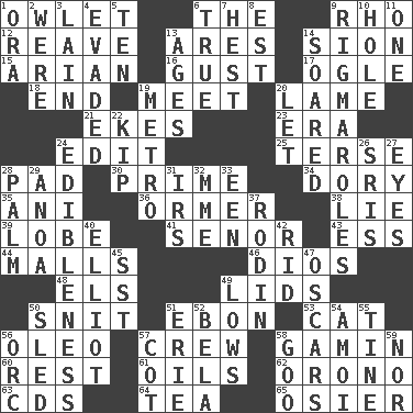 ACROSS 1. A small or young owl 6. Definite Article 9. 17th letter of the Greek alphabet 12. Rob, plunder, or pillage 13. Ancient Greek god of war 14. The Jewish people; Israel 15. Believer in; advocate of (suffix) 16. Abrupt rush of wind 17. Stare at amorously 18. Conclude 19. Rendezvous 20. Unable to walk 21. Supplements with great effort 23. Epoch 24. Prepare for publication 25. Laconic 28. Writing tablet 30. First class 34. Rowboat 35. Cuckoo 36. Channel Islands abalone 38. Whopper 39. Ear part 41. Sir (Sp.) 43. Double-curved letter 44. Shopping centers 46. "Vaya con ____" 48. Raised railways 49. Hats (slang) 50. In a ____ (agitated or irritated) 51. Inky black, to poets 53. Domesticated feline 56. Butter sub 57. Ship's personnel 58. Homeless child 60. State of inaction 61. Petroleums 62. U. of Maine site 63. Music discs 64. Afternoon social gathering 65. Flexible twig of a willow tree DOWN 1. Mouth or opening 2. We are 3. (Had) reclined 4. Dodged 5. Nine, plus one 6. Loyal 7. Command 8. Eastern Standard Time (abbr.) 9. Complicated, petty procedures 10. Hollow 11. Single 13. Matures 14. Flew 19. Paris' subway 20. Allow 22. Sleep 24. The property of being fit to eat 26. Indian titles of respect 27. Snake ____ (dice throw) 28. Inside of hand 29. Small Philippine buffalo 31. Big collection agency 32. Madame (abbr.) 33. Car or cant ending 37. "The Thinker" sculptor 40. American author Paul (1891-1958) 42. To free from 45. Fast jet (abbr.) 47. Motion picture awards 49. Moos 50. Downhill vehicle 51. 4th largest of the Great Lakes 52. Actor Lugosi 54. Mine, in Marseilles 55. Prong on a fork 56. The grampus (Milton) 57. Small bed 58. Thick or sticky substance 59. Or not