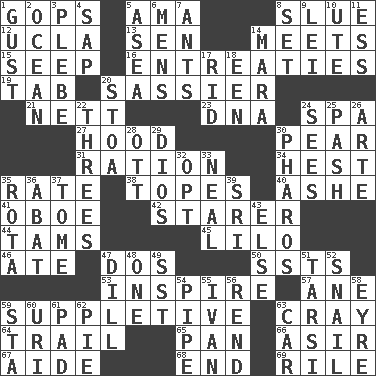 ACROSS 1. Republicans 5. Wet nurse (var.) 8. Turn sharply 12. Southern CA. univ. 13. Elected rep. 14. Confronts 15. Ooze 16. Pleas 19. Bar bill 20. More lively and spirited 21. Remaining after all deductions 23. Heredity factor (abbr.) 24. Health resort 27. Parka part 30. Lightbulb-shaped fruit 31. Food allowance for one day 34. Behest 35. Assign a rank or rating to 38. Drinks excessively 40. American tennis player Robert 41. Mitch Miller's instrument 42. A viewer who gazes fixedly 44. Scottish caps 45. _ and Stitch 46. Had dinner 47. Two (Sp.) 50. Fast planes 53. Motivate 57. A saturated hydrocarbon 59. Supplementary 63. Supercomputer manufacturer 64. Hang back 65. Baking dish 66. SW Saudi Arabia district 67. Assistant 68. Conclude 69. Cause heat under the collar DOWN 1. Abrupt rush of wind 2. Sea 3. Military trainee 4. Plant excrement 5. Toward the sea 6. Not women's 7. Pismires 8. Arrange properly for use 9. Luau accessory 10. Shoshoni 11. Double-curved letter 14. Hindu Mythology: god of death 17. To free from 18. Car or cant ending 20. Portico 22. Trios 24. Observes 25. Romantic infatuation 26. Johnson of "Laugh-In" 28. Baseball player Mel 29. "Vaya con ____" 30. N Egypt peninsula 32. Elect 33. Be tempered by heat 35. Roll call or roster of names 36. Blind as ____ 37. Heavy book 39. Indian title of respect (Mr.) 43. Otherwise 47. Deli pickle 48. Single 49. Fast jet (abbr.) 51. Tarsus (plural) 52. Slow-paced one 54. Corncob 55. "Terrible" tsar 56. Tear apart 58. Jane of fiction 59. R.R. building 60. RI univ. 61. Writing tablet 62. Sliced dessert 63. 4-wheeled motor vehicle