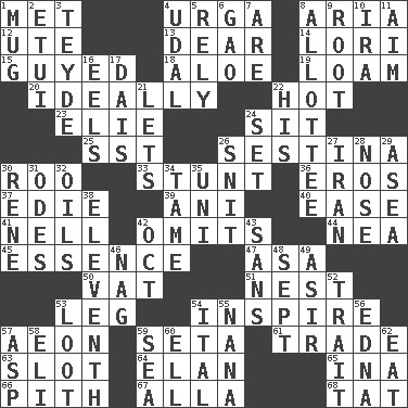 ACROSS 1. Was introduced to 4. Capital and largest city of Mongolia 8. Roberta Peters solo 12. Shoshoni 13. Letter starter 14. Australian parrot (variant) 15. Steadied 18. Medicinal plant 19. Rich soil 20. Under perfect conditions 22. Being at a high temperature 23. Writer Wiesel 24. Be seated 25. Fast jet (abbr.) 26. French poetic form 30. Friend of Pooh 33. Difficult or unusual or dangerous feat 36. Greek god of love 37. Singer Brickell 39. Black tropical American cuckoo 40. Comfort 41. 1994 drama film starring Jodie Foster 42. Leaves out 44. Teachers' org. 45. Gist 47. White ___ sheet 50. Large container 51. A home for chicks 53. Part of a journey 54. Stimulate to action 57. Age 59. Bristle 61. Barter 63. Narrow, elongated depression 64. Flair 65. _ tizzy (2 wds.) 66. Heart or essence 67. Silent film actress Nazimova 68. Make lace DOWN 1. Java container 2. Needle holder 3. Miss Universe 1986, Barbara Palacios _ 4. Freehold land 5. Have trust in 6. E Mali city 7. "We ___ not amused" (Victoria) 8. One to whom something is allotted 9. Carrot, for example 10. Retirement account (abbr.) 11. Direct toward a target or goal 16. Snakelike fish 17. Raised platform 21. Allows 22. Part of HMS, perhaps 24. Put into a specified state 26. In a ____ (agitated or irritated) 27. SW Asia republic 28. Characteristic smell of wine 29. At sea 30. French philosopher Descartes 31. Lyric poems 32. Lubricates 34. Docile 35. University (slang) 38. Veterans Day date 42. Sep. follower 43. Without 46. Tired old horse 48. Back-to-school mo. 49. SW Saudi Arabia district 52. Distinguishing feature 53. Spoils 54. Slanted text style (abbr.) 55. Grandmother 56. Pulitzer Prize-winning author Ferber 57. Cleo's killer 58. Biblical high priest 59. Ocean 60. Pipe bend 62. Ingest