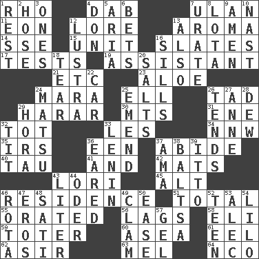 ACROSS 1. 17th letter of the Greek alphabet 4. Pat or tap gently 7. ____ Bator 11. Period of immesurable duration 12. Old wives' tales, e.g. 13. Odor 14. Compass dir. 15. A single undivided whole 16. Chalkboards 17. Trials 19. Helper 21. And so on (abbr.) 23. Medicinal plant 24. Hindu Mythology: god of death 25. Pipe bend 26. Small amount or degree 29. Ethiopian city, capital of Harari 30. Mountains (abbr.) 31. Compass dir. 32. Small child 33. French article 34. Compass dir. 35. Big collection agency 36. Car or cant ending 37. Tolerate 40. The 19th letter of the Greek alphabet 41. Also 42. Floor protectors 43. Australian parrot (variant) 45. Keyboard modifier key 46. Home 51. Add up to 55. Spoke pompously 56. Straggles 58. Connecticut Ivy Leaguer 59. Carrier 60. Toward the sea 61. Snakelike fish 62. SW Saudi Arabia district 63. Cartoonist voice _ Blanc 64. Non-commissioned officer (abbr.) DOWN 1. Repose 2. Flexible conduit 3. Washington bills 4. Spanish title 5. Roberta Peters solo 6. Wagers 7. A salt of uric acid 8. Globular water bottle used in Asia 9. So be it 10. Political cartoonist Thomas 12. A period of five years 13. In addition 16. Beverly of Met fame 18. Pull apart 20. Table seasonings 22. Automobile 24. Taiwanese island in East China Sea 25. Make improvements or corrections to 26. Looks after 27. Singer Murray 28. Morning condensation 29. Israeli folk dance 32. Teat (slang) 33. Soviet premier 1918-24 36. Having ears or earlike features 37. Housemaid (var.) 38. Greek mezzo-soprano Agnes 39. "Tell ____ the Marines!" 43. 61 cubic inches 44. Baltic tributary 46. Round or rotation of duties 47. Greek god of love 48. Suttee (variant) 49. Burrowing marine mollusk 50. Comfort 52. Adolescent 53. Actor Baldwin 54. _ and Stitch 57. Set