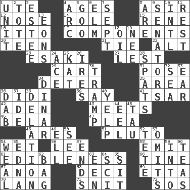 ACROSS 1. Shoshoni 4. Matures 8. SW Saudi Arabia district 12. Olfactory organ 14. Hero or heavy, e.g. 15. French philosopher Descartes 16. "Tell ____ the Marines!" 17. Pieces 20. Adolescent 21. Make a knot 22. Keyboard modifier key 23. 1973 Nobel Price Winner (Physics) Leo 27. For fear that 29. Heavy open wagon 31. Introduce or present, as a question 34. Prevent from occurring 35. Length times width 36. "You Light Up My Life" star Conn 39. Declare 41. Russian ruler of old 42. Arabian gulf 43. Confronts 46. Actor Lugosi 47. Entreaty 48. Ancient Greek god of war 51. Mickey's pet 54. Dripping 56. Area sheltered from the wind 58. Send forth 61. The property of being fit to eat 66. Prong on a fork 67. Small Philippine buffalo 68. Tenth: prefix 69. Singer James 70. Long (Scottish) 71. In a ____ (agitated or irritated) 72. Mayday DOWN 1. A single undivided whole 2. Haul 3. First name in cosmetics 4. Curve 5. Thick or sticky substance 6. Shade tree 7. Back-to-school mo. 8. "We ___ not amused" (Victoria) 9. Legislators 10. International (abbr.) 11. Take ten 13. Immeasurably long periods of time 18. Petroleum 19. Born 24. Adept person 25. Krazy ___ of comics 26. Angers 28. Arguments over trivial matters 30. _____ steamer (cargo ship) 32. Ocean 33. Ewer handle 34. Middle Eastern gold or silver currency 36. Pat or tap gently 37. Binary compound 38. Accusation by an informer 40. Sharp bark 44. Snakelike fish 45. The 19th letter of the Greek alphabet 49. Pipe bend 50. Observe 52. Wig 53. Leaves out 54. Welt 55. Pulitzer Prize-winning author Ferber 57. Extremities 59. To the inside or interior of 60. Afternoon social gatherings 62. Paper or plastic container 63. Car or cant ending 64. _-fi 65. Be seated