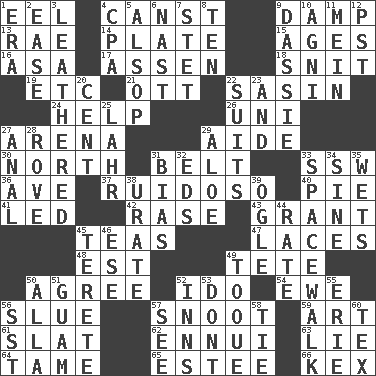 ACROSS 1. Snakelike fish 4. 2nd pers. sing. pres. of can (arch.) 9. Moist 13. Actress Charlotte 14. Food holder 15. Eras 16. White ___ sheet 17. NE Netherlands city 18. In a ____ (agitated or irritated) 19. And so on (abbr.) 21. Baseball player Mel 22. Indian antelope 24. Aid 26. Corn or form start 27. Sports stadium 29. Assistant 30. _ pole 31. Waist strap 33. Compass dir. 36. "___ Maria" 37. Noisy, rowdy, vocal (Spanish) 40. Sliced dessert 41. Directed 42. Raze (variant) 43. Let have 45. Beverages made from leaves 47. Shoestrings 48. Eastern Standard Time (abbr.) 49. False hair 50. Match 52. Wedding promise 54. She-sheep 56. Change direction abruptly 57. Snout, nose 59. Nonscientific branch of learning 61. Narrow board 62. World-weariness 63. Untruth 64. Docile 65. First name in cosmetics 66. A weed DOWN 1. Period 2. Comfort 3. Resembling or made to resemble leather 4. Accounting whiz (abbr.) 5. Columnist Joseph or Stewart 6. Political cartoonist Thomas 7. Proofreading order 8. "___ Little Indians" 9. Small ungulate mammals of Africa 10. Hindu god of fire 11. Count _ (2 wds.) 12. Pacific Standard Time (abbr.) 20. Penny 22. Sets or collections 23. Added to 25. Cowardly lion portrayer 27. Of or related to the anus 28. Be footloose 29. _ vera 31. Prejudice 32. Begley and Asner 33. High altitude stroll 34. Trig term 35. Moistens 38. A salt of uric acid 39. Stare 44. Assign a rank or rating to 45. Cigar-shaped 46. Compass dir. 49. Woman's close-fitting hat 50. Silent film actress Nazimova 51. Island territory of the United States 52. Taverns 53. Do not 55. One of the Great Lakes 56. Fast jet (abbr.) 57. Observe 58. Neckwear 60. John Ritter's dad