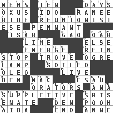 ACROSS 1. Not women's 5. "___ Little Indians" 8. 24-hour periods 12. Amu Darya 13. Wedding promise 14. The wife of a rajah (variant) 15. Travel on an animal 16. One who advocates reunion 19. Compass dir. 20. Pre-World Series prize 21. Russian ruler of old 23. E Mali city 24. Rowing implement 27. Welles in "The Third Man" 30. Otherwise 31. Develop 34. It's straight from the horse's mouth 35. Cease 38. Collection of objects 40. Legendary monster 41. Desk light 42. Dirtied 44. Margarine 45. Moving, as bait 46. Benjamin's nick name 47. Apple computer (short form) 50. Son of Isaac 53. Speakers 57. Santa ___, CA 59. Supplementary 63. Indian titles of respect 64. Related on the mother's side 65. Lair 66. "Silly old bear" 67. Opera by Verdi 68. Conclusion 69. Queen of England 1702-14 DOWN 1. Greater amount 2. Be 3. Unadorned figures 4. Compass dir. 5. Become fatigued 6. Paradise 7. Part of speech 8. One of the 12 tribes of Israel 9. Black tropical American cuckoo 10. Affirmative reply 11. Put into a specified state 14. Printing process, for short 17. Tired old horse 18. _ tizzy (2 wds.) 20. Demure 22. City in Syria 24. Cassini of fashion 25. SW Saudi Arabia district 26. French philosopher Descartes 28. Was introduced to 29. Blunders 30. Eats (away) 32. Thick or sticky substance 33. Tending to cause great harm 35. Oscar Madison type 36. Falsehood 37. Sign of something about to happen 39. Biblical high priest 43. Nights before holidays 47. Undercover agent 48. "We ___ not amused" (Victoria) 49. Domesticated feline 51. Composer Copland 52. The state of being joined or united 54. Event that recurs at intervals 55. Baking chamber 56. Tear apart 58. American tennis player Robert 59. Ocean 60. Corn or form start 61. Writing tablet 62. Parent Teacher Assoc. 63. Health resort