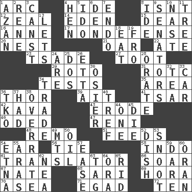 ACROSS 1. Curve 4. Flintstone garb 8. Is not 12. Ardor 14. Locale of original sin 15. Letter starter 16. Singer Murray 17. Unrelated to defense, as in spending 20. A home for chicks 21. Rowing implement 22. Had dinner 23. Sadhe (variant) 27. A blast of a horn 29. Printing process, for short 31. College mil. group 34. Trials 35. Length times width 36. Son of Odin 39. Small island 41. Russian ruler of old 42. Polynesian shrub of the pepper family 43. Wear away 46. Wrote a lyric poem 47. Painter Guido (1575-1642) 48. San ____ (Riviera town) 51. Eats 54. Ewer handle 56. Neckwear 58. Southeast Asian peninsula 61. Interpreter 66. Fly high 67. Nathan's nickname 68. Indian skirt 69. Israeli folk dance 70. Toward the sea 71. Mild oath 72. "___ Little Indians" DOWN 1. Muslim summons to prayer 2. French philosopher Descartes 3. 2nd pers. sing. pres. of can (arch.) 4. Layer 5. Wedding promise 6. Lair 7. Inside; within (prefix) 8. Binary compound 9. Elected representatives 10. Political cartoonist Thomas 11. Family _ (genealogy) 13. Allows 18. Consume 19. Away 24. "We ___ not amused" (Victoria) 25. Two (Sp.) 26. Singer James 28. Speak pompously 30. Flexible twig of a willow tree 32. Afternoon social gathering 33. Auto 34. Buy and sell 36. Ring climax 37. Possessed 38. Make much ado about nothing 40. Unclean, religiously 44. Single 45. Expire 49. Mountains (abbr.) 50. Lubricate 52. Food container 53. Snout, nose 54. Inactive volcano in Sicily 55. Ancient river in northeast Turkey 57. Comfort 59. Have the gumption 60. NW Algerian seaport 62. Teachers' org. 63. Label 64. Mouth or opening 65. To free from
