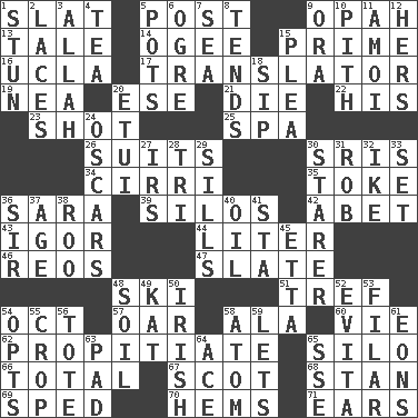 ACROSS 1. Narrow board 5. Mail 9. Brightly colored fish 13. Falsehood 14. Double curve, resembling the letter S 15. A-one 16. Southern CA. univ. 17. Interpreter 19. Teachers' org. 20. Compass dir. 21. Expire 22. Part of HMS, perhaps 23. Guess 25. Health resort 26. Sets of matching outer garments 30. Indian titles of respect 34. High-altitude cloud 35. Casino tip 36. "Two Mules for Sister ____" 39. Grain storage towers 42. Collude with 43. Russian composer Stravinsky 44. 61 cubic inches 46. Vintage cars 47. Schedule 48. What Jean-Claude Killy likes to do 51. Not kosher 54. Sep. follower 57. Rowing implement 58. In the manner of 60. Compete 62. Appease 65. Grain storage tower 66. "_____ Recall" 67. Native of Scotland 68. Comedian Laurel of Laurel & Hardy 69. Hurried 70. Folds over and sews together 71. Hearing organs DOWN 1. Astound 2. Shoestrings 3. Assad's deity 4. Beverage made from leaves 5. Cooking vessels 6. Legendary monster 7. Ocean 8. Is inclined (to) 9. Mouth or opening 10. Heart or essence 11. Mine, in Marseilles 12. Possessive pronoun 15. Entreaty 18. Small drink 20. Needle case 24. Motion picture awards 27. Big collection agency 28. Three (prefix) 29. Beverly of Met fame 30. A viewer who gazes fixedly 31. Director Reiner 32. Mamie's husband 33. Put into a specified state 36. Title for a knight 37. Mature 38. Friend of Pooh 40. Lubricate 41. R.R. building 45. Singer James 48. Earth 49. Krazy ___ of comics 50. From or relating to Ireland 52. Webber/Rice musical 53. Of or pertaining to a thread or threads 54. Elects 55. Riding implement 56. Carry 58. Smallest unit of an element 59. Allows 61. Immeasurably long periods of time 63. Groovy apt. 64. Adept person 65. Compass dir.