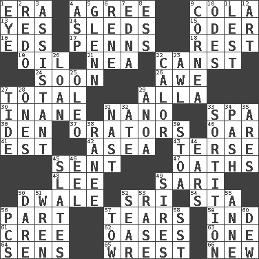 ACROSS 1. Period 4. Match 9. Root beer relative 13. Consenting reply 14. Bobsleighs 15. Baltic tributary 16. Begley and Asner 17. Actor Sean's family 18. Take ten 19. Petroleum 21. Teachers' org. 22. 2nd pers. sing. pres. of can (arch.) 24. Within a short period 26. Deep reverence 27. Add up to 29. Silent film actress Nazimova 30. Lacking in sense or substance 31. Billionth: prefix 33. Health resort 36. Lair 37. Speakers 40. Boat paddle 41. Eastern Standard Time (abbr.) 42. Toward the sea 43. Laconic 45. Transmitted 47. Curses 48. Area sheltered from the wind 49. Indian skirt 50. A sleeping potion; an opiate (poet.) 52. Indian title of respect (Mr.) 54. R.R. building 56. Component 57. Rends 59. Working for oneself (abbr.) 61. Algonquian 62. Fertile tracts in a desert 63. Single 64. Elected reps. 65. Take or capture by force 66. ___ Haven, CT DOWN 1. Sight organ 2. Redecorate 3. Helper 4. Cleo's killer 5. American astronaut and politician John 6. French philosopher Descartes 7. Pulitzer Prize-winning author Ferber 8. Curvy letter 9. Pupil covering 10. Lyric poems 11. For fear that 12. Nonscientific branch of learning 20. Grant temporary use of 22. Bodily heat indicating an inflammation 23. Leather borer 25. Butter sub 27. Event that recurs at intervals 28. Washington bills 29. Small Philippine buffalo 31. Political cartoonist Thomas 32. Had dinner 33. Decision 34. Romantic infatuation 35. Ancient Greek god of war 38. The wife of a rajah (variant) 39. Portico 44. Hearing organs 45. Chalkboards 46. Snakelike fish 49. Fathers 50. Have the gumption 51. Songbird 52. Singe 53. Raze (variant) 55. Singer Murray 56. Personal Computers (abbr.) 57. Pull behind 58. Fast jet (abbr.) 60. Morning condensation