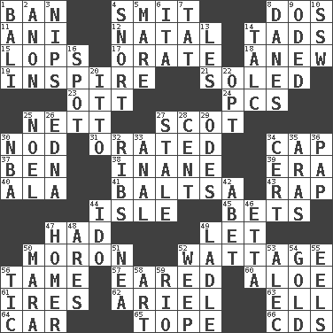 ACROSS 1. Bar 4. Stricken, poetically 8. Two (Sp.) 11. Cuckoo 12. Relating to or accompanying birth 14. Small amounts or degrees 15. Chops off 17. Declaim 18. Afresh 19. Stimulate to action 21. Having a sole or soles 23. Baseball player Mel 24. Personal Computers (abbr.) 25. Remaining after all deductions 27. Highlander 30. Dreamland 31. Spoke pompously 34. Head covering 37. Benjamin's nick name 38. Empty; void 39. Period 40. Insect wing 41. Greek mezzo-soprano Agnes 43. Hit sharply and swiftly 44. Capri or Wright 45. Antes 47. Possessed 49. Allow 50. Person of subnormal intelligence 52. Electrical Measurement 56. Not wild 57. Having ears or earlike features 60. Medicinal plant 61. Angers 62. Satellite of Uranus 63. Pipe bend 64. Automobile 65. Drink excessively 66. Music discs DOWN 1. Indonesian resort city 2. Soon (poet.) 3. Pinches, bites 4. Derisive sound 5. Female horse 6. Call ___ day 7. Make lace 8. Natives or inhabitants of Denmark 9. Wrote a lyric poem 10. Compass dir. 13. French article 14. Baby powder 16. Blemish 20. "Tell ____ the Marines!" 22. Choose 25. Christmas carol 26. Pulitzer Prize-winning author Ferber 27. Having lost freshness 28. Penny 29. Lyric poems 30. Basketball assoc. 32. Teases 33. Of or related to the anus 34. Foregone conclusion 35. Ancient river in northeast Turkey 36. Infant food 42. Collude with 44. Wedding promise 46. Singer James 47. Simpsons dad 48. Ancient Greek god of war 49. Dipping utensil 50. Hindu Mythology: god of death 51. Teachers' org. 52. Shed a tear 53. Actor Baldwin 54. Gilt 55. Snakelike fish 56. Nervous spasm 58. Nonscientific branch of learning 59. _ de Janeiro