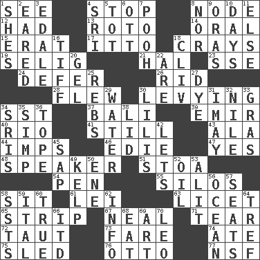 ACROSS 1. Observe 4. Discontinue 8. Connecting point 12. Possessed 13. Printing process, for short 14. Taken by mouth 15. Part of Q.E.F. 17. "Tell ____ the Marines!" 18. Trading vessels 19. Former Milwaukee Brewers owner Bud 21. Actor Linden 23. Compass dir. 24. Put off 26. To free from 28. Soared 30. Imposing or collecting, as a tax 34. Fast jet (abbr.) 37. Indonesian resort city 39. Arab leader 40. _ de Janeiro 41. Not moving 43. According to 44. Naughty children 46. Singer Brickell 47. Consenting reply 48. Orator 51. Portico 54. Animal enclosure 55. Grain storage towers 58. Be seated 61. Flowery wreath 63. It is permitted: Lat. 65. Empty completely 67. Be tempered by heat 71. Lacerate 72. Drawn tight 73. Conductor's collection 74. Had dinner 75. Downhill vehicle 76. Von Bismarck 77. Science/research agcy. DOWN 1. "______ My Girl" (Turtles hit) 2. Having ears or earlike features 3. Peak District village in England 4. Indian title of respect (Mr.) 5. Small child 6. Baseball player Mel 7. "Silly old bear" 8. Not either 9. Mouths or openings 10. 24-hour periods 11. Otherwise 16. Small quarrel 18. 154 in Roman numerals 20. Set 22. "We ___ not amused" (Victoria) 25. Confederate soldiers (slang) 27. Color 29. Wetness 30. Ms. Damita and namesakes 31. "If ____ say so..." 32. "Death on the ____" 33. Pate de foie ____ 34. Indian titles of respect 35. Simple or foolish person 36. Drink excessively 38. Hat (slang) 42. Allows 45. Plant excrement 49. Seaweed 50. Compass dir. 52. Lubricate 53. Set down 56. Sea 57. Theater features 58. Fast planes 59. Slanted text style (abbr.) 60. Loyal 62. Information 64. Not kosher 66. It would 68. Erode 69. Nonscientific branch of learning 70. Lion