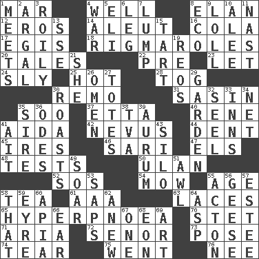 ACROSS 1. Make imperfect 4. Not ill 8. Style 12. Greek god of love 14. Eskimo relative 16. Root beer relative 17. The front part of a cuirass 18. Complicated, petty procedures 20. Lies 22. Before (prefix) 23. Allow 24. Insidious 25. Being at a high temperature 28. Coat; cloak 30. San ____ (Riviera town) 31. Indian antelope 35. "Barney Miller" actor Jack 37. Singer James 40. French philosopher Descartes 41. Opera by Verdi 42. Mole, birthmark 44. Gouge 45. Angers 46. Indian skirt 47. Raised railways 48. Trials 50. Uhlan (variant) 52. Distress signal 54. Cut the grass 55. Mature 58. Beverage made from leaves 61. Auto club (abbr.) 63. Shoestrings 65. Abnormally rapid or deep breathing 70. Proofreading order 71. Operatic vocal solo 72. Sir (Sp.) 73. Airs 74. Pull apart 75. Left 76. Born DOWN 1. Confronts 2. Therefore, facetiously 3. Agitated, as a liquid 4. Armed conflict 5. Connecticut Ivy Leaguer 6. Part of a journey 7. Mass 8. Environmental prefix 9. Hang loosely or laxly 10. Toward shelter 11. Political cartoonist Thomas 13. Compass dir. 15. Small pie 19. Vintage cars 21. A female animal or person 26. Presage 27. Hauls 29. Place where plants grow 30. Ridicules or criticizes harshly 32. Stitch closed the eyes of (a falcon) 33. Lodging establishments 34. Fish or hair follower 35. Beget 36. Lyric poems 38. Federal power corp. 39. Gold (Symbol: Au) 41. Small island 43. Grain storage tower 49. Fly high 51. Leather borer 53. Plant excrements 55. Gambison 56. Honkers 57. First name in cosmetics 58. Not this but _ 59. Jane of fiction 60. Capital of Western Samoa 62. Afresh 64. Cleo's killer 66. Hearing organ 67. Single 68. A really long time 69. Nonscientific branch of learning