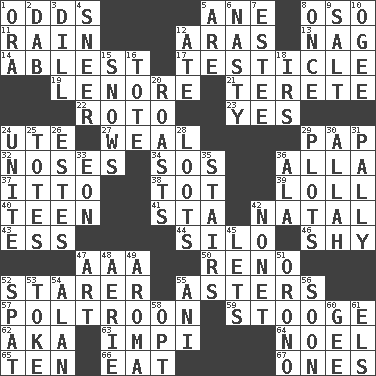 ACROSS 1. Likelihood 5. One (Scot) 8. Bear (Spanish) 11. Precipitation 12. Ancient river in northeast Turkey 13. Tired old horse 14. Most capable 17. One of the two male reproductive glands 19. Poe poem 21. Cylindrical with tapered ends 22. Printing process, for short 23. It is so 24. Shoshoni 27. Welt 29. Infant food 32. Olfactory organs 34. Distress signal 36. Silent film actress Nazimova 37. "Tell ____ the Marines!" 38. Small child 39. Hang loosely or laxly 40. Adolescent 41. R.R. building 42. Brizilian seaport 43. Curvy letter 44. Grain storage tower 46. Like a shrinking violet 47. American Automobile Association (abbr.) 50. Western Nevada city 52. A viewer who gazes fixedly 55. Michaelmas daisies 57. Characterized by complete cowardliness 59. Moe Howard, for one 62. Alias (abbr.) 63. Body of Kaffir warriors 64. Christmas carol 65. "___ Little Indians" 66. Ingest 67. Washington bills DOWN 1. Mouth or opening 2. Small moist lump or mass 3. Deli pickle 4. Scornful expression 5. "We ___ not amused" (Victoria) 6. Offensive 7. First name in cosmetics 8. Single time 9. Table seasoning 10. Double curve, resembling the letter S 12. Had dinner 15. Frozen precipitation (plural) 16. Carryall 18. Big collection agency 20. Exposes to great heat 24. Join together 25. Lugs 26. _____ Park, CO 28. Plunders 29. Secret plans 30. Assad's deity 31. Friendly 33. A really long time 35. Flight of steps 36. Wing 42. Music written for nine 45. Allows 47. Tate display 48. Nest on high 49. Odor 51. U. of Maine site 52. Petty quarrel 53. Puff or smoke 54. Actor Alda or Thicke 55. Cuckoo 56. Within a short period 58. Elect 60. Unit of force equal to gravity 61. Raised railways