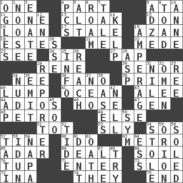 ACROSS 1. Single 4. Piece 8. _ moment's notice (2 wds.) 11. Went 13. Anything that covers or conceals 15. Spanish title 16. Grant temporary use of 17. Lacking originality or spontaneity 18. Muslim summons to prayer 19. _____ Park, CO 21. Cartoonist voice _ Blanc 22. Ancient Persian 23. Observe 24. Title for a knight 27. Infant food 29. French philosopher Descartes 30. Sir (Sp.) 34. Born 36. Papal veil 39. A-one 40. Mass 41. Sea 43. Toward shelter 44. Goodbye (Sp.) 46. Flexible conduit 47. Commissioned mil. rank 48. Stone: prefix 49. Otherwise 51. Small child 53. Stealthy 54. Distress signal 57. Prong on a fork 60. Wedding promise 63. Paris' subway 65. The sixth month of the Jewish calendar 66. Started a card game 69. Earth 70. Uncastrated adult male sheep 71. Keyboard key 72. _ gin 73. _ tizzy (2 wds.) 74. Those things 75. Conclude DOWN 1. Stares at amorously 2. Trap for birds or small mammals 3. Related on the mother's side 4. Personal Computers (abbr.) 5. The first octave above the treble staff 6. Wander aimlessly 7. Falsehood 8. Axlike tool, used for shaping wood 9. Frog relative 10. Queen of England 1702-14 12. Compass dir. 14. Seaweed 18. Electrical Measurement 20. Compass dir. 25. A message received and understood 26. Arrive at 28. Cleo's killer 29. News announcer 31. The longest river in the world 32. Sign of something about to happen 33. To sift 34. Unadorned 35. Give off 37. Modern: prefix 38. Fertile tracts in a desert 40. Pet locale 42. 1994 drama film starring Jodie Foster 45. "Barney Miller" actor Jack 50. Symbol (abbr.) 52. Event that recurs at intervals 54. Took without asking 55. Greek mythologigal hunter 56. Having a sole or soles 57. Jacques of French films 58. Goddess of spring and wife of Bragi 59. California wine valley 61. Scratch 62. Pledge 64. Curvy letter 67. Area sheltered from the wind 68. Attempt to accomplish something