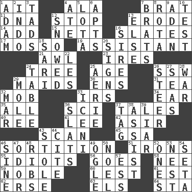 ACROSS 1. Small island 4. Insect wing 7. Naughty child 11. Heredity factor (abbr.) 12. Close up, plug up 13. Eat (away) 14. Increase 15. Remaining after all deductions 16. Chalkboards 17. With motion or animation 19. Aide 21. Leather borer 23. Angers 24. Relationship diagram 25. Ripen 26. Compass dir. 29. Women servants 30. Followers of ems 31. Beverage made from leaves 32. Crowd into 33. Big collection agency 34. Hearing organ 35. 100% 36. _-fi 37. Stories 40. To separate or throw off 41. Area sheltered from the wind 42. SW Saudi Arabia district 43. Skim 45. Girls' org. (abbr.) 46. Drawing lots 51. Removes the wrinkles 55. Foolish or stupid persons 56. Travels 58. Born 59. Impressive in appearance 60. For fear that 61. Eastern Standard Time (abbr.) 62. Celtic language 63. Raised railways 64. R.R. building DOWN 1. First man 2. Southeast Asian peninsula 3. Small amounts or degrees 4. Had dinner 5. Globular water bottle used in Asia 6. Tenement units (abbr.) 7. Naughty children 8. Round or rotation of duties 9. An important port of Yemen 10. Trial 12. Frozen precipiation fell 13. Otherwise 16. Begets 18. Indian skirt 20. Signals 22. French article 24. Eating place 25. Nest on high 26. Guide 27. Oceans 28. Armed conflict 29. Undercover agent 32. Impair 33. Ancient Celtic tribe of eastern Britain 36. Narrow boards 37. Label 38. Aid 39. One who doesn't tell the truth 43. Fur scarf 44. Quote 46. Trig term 47. Scent 48. Teases 49. Stare at amorously 50. Christmas carol 52. Washington bills 53. Egg locale 54. Stalk of a moss capsule 57. Double-curved letter