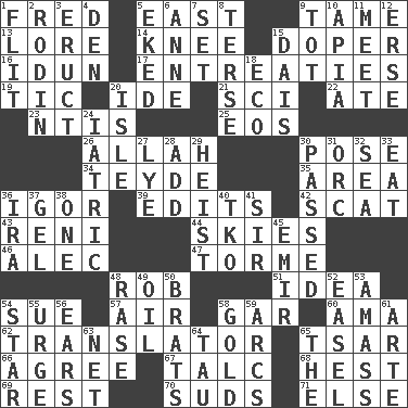 ACROSS 1. Flintstone 5. Compass direction 9. Not wild 13. Old wives' tales, e.g. 14. Leg joint 15. Drug addict 16. Goddess of spring and wife of Bragi 17. Pleas 19. Nervous spasm 20. Binary compound 21. _-fi 22. Had dinner 23. Nuclear Threat Initiatives 25. Greek goddess of the dawn 26. Assad's deity 30. Introduce or present, as a question 34. Miss Universe 1986, Barbara Palacios _ 35. Length times width 36. Russian composer Stravinsky 39. Prepares for publication 42. Go away! 43. Painter Guido (1575-1642) 44. Atmospheres 46. Actor Baldwin 47. Singer Mel 48. Director Reiner 51. The content of cognition 54. Institute legal proceedings 57. Atmosphere 58. Slender fish 60. Wet nurse (var.) 62. Interpreter 65. Russian ruler of old 66. Match 67. Baby powder 68. Behest 69. Respite 70. Soap bubbles 71. Otherwise DOWN 1. Sudden quick movement 2. "The Thinker" sculptor 3. Spew [out] 4. Lair 5. Made supply last 6. Queen of England 1702-14 7. Arrange properly for use 8. Laconic 9. Small child 10. Capital of Western Samoa 11. Confront 12. Celtic language 15. Raised platform 18. Environmental prefix 20. Capri or Wright 24. Of or pertaining to medicine 27. Potassium hydroxide 28. Find the sum of 29. Robbery 30. Went by 31. The grampus (Milton) 32. Ocean 33. Ingest 36. Lyricist Gershwin 37. Set 38. Single 40. Ring climax 41. Title for a knight 45. Arab leader 48. Raze (variant) 49. Lubricate 50. Naughty children 52. Artist's stand 53. Collect or gather 54. Play the lead 55. Goad 56. Hearing organs 58. Aureate 59. Curves 61. Johnson of "Laugh-In" 63. Fish or hair follower 64. The 19th letter of the Greek alphabet 65. Definite Article