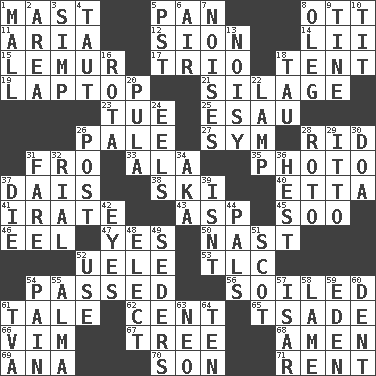 ACROSS 1. Vertical spar for supporting sails 5. Baking dish 8. Baseball player Mel 11. Operatic vocal solo 12. The Jewish people; Israel 14. Cards in a Roman deck? 15. Arboreal primate 17. Musical group of three 18. Portable shelter 19. Portable computer 21. Fodder prepared in a silo 23. Third day of the wk. 25. Son of Isaac 26. Diluted with white 27. Symbol (abbr.) 28. To free from 31. From 33. According to 35. Picture 37. Raised platform 38. What Jean-Claude Killy likes to do 40. Singer James 41. Feeling or showing extreme anger 43. Cleo's killer 45. "Barney Miller" actor Jack 46. Snakelike fish 47. Affirmative reply 50. Political cartoonist Thomas 52. Ubangi River tributary 53. Affectionate concern, for short 54. Went by 56. Dirtied 61. Story 62. Penny 65. Sadhe (variant) 66. Zeal 67. Woody plant 68. So be it 69. Santa ___, CA 70. Boy, to dad 71. Monthly bill DOWN 1. Promenade 2. Type of rug 3. Simple or foolish person 4. Strained 5. Pacific Standard Time (abbr.) 6. Wind 7. Annoying sounds 8. Cassini of fashion 9. Prong on a fork 10. Teat (slang) 13. Annoyingly loud 16. Round or rotation of duties 18. The 19th letter of the Greek alphabet 20. Monetary unit of Botswana 22. Desk light 24. Snakelike fish 26. Mail 28. Printing process, for short 29. "Tell ____ the Marines!" 30. ___ good deed 31. Conductor's collection 32. Monetary unit of Yemen 34. Alias (abbr.) 36. Command 37. Expire 39. Is not 42. Sight organs 44. Friends 48. Opt 49. Spring feasts 51. Highlander 52. Purpose 54. Ache 55. _ mater 57. Austrian river, tributary to the Danube 58. Unable to walk 59. Paradise 60. Gouge 61. Federal power corp. 63. Modern: prefix 64. "___ Little Indians"