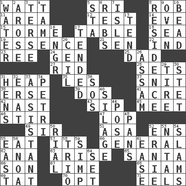 ACROSS 1. Electrical Unit 5. Indian title of respect (Mr.) 8. Director Reiner 11. Length times width 12. Trial 14. Night before a holiday 15. Singer Mel 17. Eating place 18. Ocean 19. Gist 21. Elected rep. 22. Indiana (abbr.) 23. To separate or throw off 24. Commissioned mil. rank 25. June honoree 27. To free from 28. Puts into a specified state 31. Pile 35. French article 37. In a ____ (agitated or irritated) 38. Celtic language 39. Two (Sp.) 41. Measure of real estate 42. Political cartoonist Thomas 43. Small drink 45. Confront 46. Move through with a circular motion 47. Chop off 49. Title for a knight 51. White ___ sheet 52. Followers of ems 55. Ingest 57. ___ a Wonderful Life 60. Commissioned military rank 62. Santa ___, CA 63. Ascend 65. Before Barbara or Clara 66. Manchild 67. Welles in "The Third Man" 68. Thailand, formerly 69. Make lace 70. Choose 71. Snakelike fish DOWN 1. Wetness 2. Came up 3. Laconic 4. Not wild 5. R.R. building 6. Confederate soldiers (slang) 7. Small island 8. Home 9. Baking chamber 10. Necklace unit 13. Be inclined (to) 16. Engineer (abbr.) 17. Looked after 20. To provide with a ceiling 26. Indian state 29. Hoop that covers a wheel 30. Proofreading order 31. Coop moms 32. Part of Q.E.F. 33. Aide 34. _ dish (used to culture cells) 36. Distress signal 40. Fodder prepared in a silo 44. Airs 48. Baking dishes 50. Monetary unit of Yemen 52. Bert's buddy 53. Brizilian seaport 54. Shuts with force 55. 90 degrees 56. Small Philippine buffalo 58. Musical group of three 59. Simple or foolish person 61. Relaxation 64. Arrange properly for use