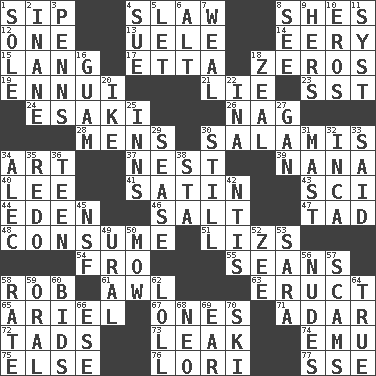 ACROSS 1. Small drink 4. Cole _ (cabbage dish) 8. "______ My Girl" (Turtles hit) 12. Single 13. Ubangi River tributary 14. Suggestive of the supernatural 15. Long (Scottish) 17. Singer James 18. Nothings 19. World-weariness 21. Whopper 23. Fast jet (abbr.) 24. 1973 Nobel Price Winner (Physics) Leo 26. Tired old horse 28. Not women's 30. Deli grouping 34. Tate display 37. Egg locale 39. Nanny 40. Area sheltered from the wind 41. Smooth fabric 43. _-fi 44. Paradise 46. Table seasoning 47. Small boy 48. Ingest 51. Belonging to Elizabeth 54. Away 55. Seines 58. Director Reiner 61. Leather borer 63. Spew [out] 65. Satellite of Uranus 67. Washington bills 71. The sixth month of the Jewish calendar 72. Bits 73. Path through which fluid escapes 74. Australian flightless bird 75. Otherwise 76. Australian parrot (variant) 77. Compass dir. DOWN 1. Flatfish 2. Silly 3. Actor Sean's family 4. Institute legal proceedings 5. Allow 6. The first octave above the treble staff 7. Welt 8. Observe 9. Possessive pronoun 10. Greek god of love 11. System (abbr.) 16. Island territory of the United States 18. Ardor 20. Eisenhower's nickname 22. _ tizzy (2 wds.) 25. Taverns 27. Separate the seeds from cotton 29. Gospel singer Marvin 30. Free of sound 31. Vertical spar for supporting sails 32. South American Indian 33. Stated 34. Actor Baldwin 35. Make new 36. Adolescent 38. R.R. building 42. Nuclear Threat Initiatives 45. Overdraft (abbr.) 49. Mountain range 50. Cut the grass 52. Last letter of the English alphabet 53. "Two Mules for Sister ____" 56. Unclothed pictures 57. Fraudulent business schemes 58. Assign a rank or rating to 59. Relating to the mouth 60. Auction offers 62. Hang loosely or laxly 64. Loyal 66. Compass dir. 68. Modern: prefix 69. Ewer handle 70. What Jean-Claude Killy likes to do