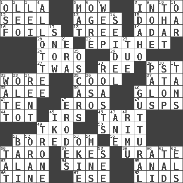 ACROSS 1. Rounded earthenware pot or jar 5. Cut the grass 8. To the inside or interior of 12. Stitch closed the eyes of (a falcon) 13. Matures 15. Capital of the state of Qatar 16. Fencing necessities 18. Relationship diagram 19. The sixth month of the Jewish calendar 20. Single 22. Curse 24. "Corrida" creature 26. Superhero pair 27. It was, poetically 28. To sift 29. Pacific Standard Time (abbr.) 32. Had on 35. Calm and collected 37. _ moment's notice (2 wds.) 38. Toward shelter 39. White ___ sheet 40. Take by theft 41. Nine, plus one 42. Greek god of love 43. United States Postal Service (abbr.) 44. Small child 45. Big collection agency 46. Small pie 49. Ring climax 50. In a ____ (agitated or irritated) 51. Mood resulting from idleness 55. Australian flightless bird 56. Pacific island yam 57. Supplements with great effort 59. A salt of uric acid 63. ____ Jay Lerner 64. Trig term 65. Of or related to the anus 66. Prong on a fork 67. Compass dir. 68. Hats (slang) DOWN 1. Order of Saint Francis (abbr.) 2. Lion 3. Luau accessory 4. One to whom something is allotted 5. Floor covering 6. Legendary monster 7. Shed a tear 8. Potato state 9. Thickened enlargement 10. Not this but _ 11. Boat paddle 14. Beer mug 17. Frozen precipitation 21. Epoch 23. Third day of the wk. 25. Motion picture awards 28. Ridicules or criticizes harshly 29. Friends 30. Constrict 31. Scottish caps 32. Electrical Unit 33. Butter sub 34. Monthly bill 36. Bear (Spanish) 40. From the throat 42. Eats (away) 45. Mamie's mate 47. One (Scot) 48. Tall New Zealand timber tree 49. Heavy duty weighing machine 51. Indonesian resort city 52. Northwest Algerian city 53. Migrant worker of the '30s 54. Not women's 56. Make lace 58. Observe 60. Cuckoo 61. Bit 62. Raised railways