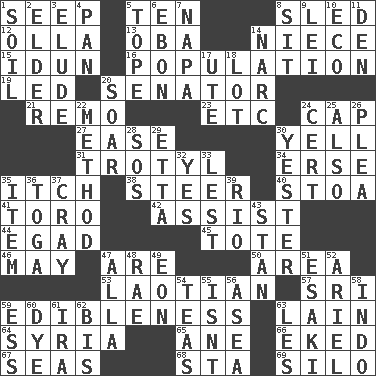ACROSS 1. Ooze 5. Nine, plus one 8. Downhill vehicle 12. Spanish pot 13. Chief or king in Benin or Nigeria 14. Sibling's daughter 15. Goddess of spring and wife of Bragi 16. Census information 19. Directed 20. Legislator 21. San ____ (Riviera town) 23. And so on (abbr.) 24. Head covering 27. Comfort 30. Shout 31. TNT 34. Celtic language 35. Hankering 38. Guide 40. Portico 41. "Corrida" creature 42. Help 44. Mild oath 45. Haul 46. Fifth month 47. "We ___ not amused" (Victoria) 50. Length times width 53. Of or relating to Laos or its people 57. Indian title of respect (Mr.) 59. The property of being fit to eat 63. (Had) reclined 64. Damascus' land 65. One (Scot) 66. Made supply last 67. Oceans 68. R.R. building 69. Grain storage tower DOWN 1. Earth 2. A person who is older than you are 3. Dodge 4. Baking dish 5. Drink excessively 6. Inky black, to poets 7. California wine valley 8. Be seated 9. Luau accessory 10. Environmental prefix 11. Lair 14. Drug cop 17. Shoshoni 18. Car dealer's back yard 20. Fly high 22. Mode 24. Foregone conclusion 25. In addition 26. Entreaty 28. Mayday 29. Singer James 30. Of or pertaining to yesterday 32. Affirmative reply 33. For fear that 35. A distinct part 36. Ancient Roman robe 37. Supercomputer manufacturer 39. River (Sp.) 43. Comedian Laurel of Laurel & Hardy 47. Silent film actress Nazimova 48. Actress Charlotte 49. A really long time 51. 1973 Nobel Price Winner (Physics) Leo 52. Satellite of Uranus 54. Beverages made from leaves 55. Is not 56. Toward the sea 58. Southeast Asian peninsula 59. Curvy letter 60. Color 61. Lyricist Gershwin 62. Twice 63. French article