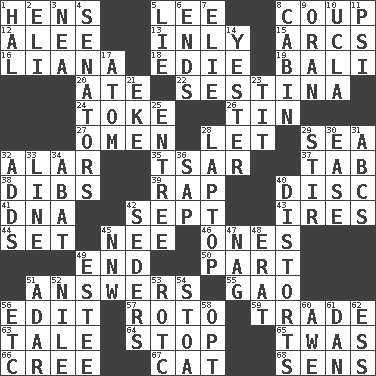 ACROSS 1. Coop moms 5. Area sheltered from the wind 8. Overturn; upset 12. Toward shelter 13. Inwardly 15. Curves 16. Woody, climbing, usually tropical plant 18. Singer Brickell 19. Indonesian resort city 20. Had dinner 22. French poetic form 24. Casino tip 26. Shallow baking pan 27. Presage 28. Allow 29. Ocean 32. Having or resembling wings 35. Russian ruler of old 37. Bar bill 38. Rights 39. Hit sharply and swiftly 40. Compact _ 41. Heredity factor (abbr.) 42. Back-to-school mo. 43. Angers 44. Put into a specified state 45. Born 46. Washington bills 49. Conclusion 50. Role in a play 51. Replies 55. E Mali city 56. Prepare for publication 57. Printing process, for short 59. Swap 63. Story 64. Close up, plug up 65. It was, poetically 66. Algonquian 67. Domesticated feline 68. Elected reps. DOWN 1. Actor Linden 2. Connecticut Ivy Leaguer 3. Teachers' org. 4. Legislators 5. Untruth 6. Extremities 7. Writer Wiesel 8. Small house or cottage 9. Northwest Algerian city 10. Southern CA. univ. 11. 23rd letter of the Greek alphabet 14. Last 17. Smallest unit of an element 21. Supplement with great effort 23. Teat (slang) 25. Main course 28. Portable computer 29. Tumult 30. Relaxation 31. Lettered men learn these first 32. Sums up 33. Actor's bit 34. Blind as ____ 36. Plant excrement 40. What propaganda does 42. Spring feasts 45. Compass dir. 47. Tired old horse 48. Part of Q.E.F. 49. First name in cosmetics 51. The sixth month of the Jewish calendar 52. "Death on the ____" 53. College mil. group 54. Portico 56. And so on (abbr.) 58. Elect 60. Deep reverence 61. One of the 12 tribes of Israel 62. Curvy letter