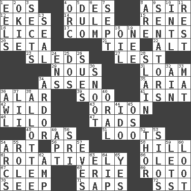 ACROSS 1. Greek goddess of the dawn 4. Lyric poems 8. SW Saudi Arabia district 12. Makes supply last 14. General guideline 15. French philosopher Descartes 16. Louse (plural) 17. Pieces 20. Bristle 21. Standoff 22. Keyboard modifier key 23. Bobsleighs 27. For fear that 29. Horse sense 31. Rich soil 34. NE Netherlands city 35. Operatic vocal solo 36. Having or resembling wings 39. "Barney Miller" actor Jack 41. Is not 42. Rampant 43. Constellation of myth 46. _ and Stitch 47. Bits 48. Mouths or openings 51. Plunders 54. Tate display 56. Before (prefix) 58. Land elevation 61. Rotating or pertaining to rotation 66. Butter sub 67. To starve (Brit.) 68. 4th largest of the Great Lakes 69. Printing process, for short 70. Ooze 71. Plant excrements 72. Fast jet (abbr.) DOWN 1. Snakelike fish 2. Migrant worker of the '30s 3. Religious groups 4. The grampus (Milton) 5. Superhero pair 6. Shade tree 7. Back-to-school mo. 8. "We ___ not amused" (Victoria) 9. Legislators 10. International (abbr.) 11. Take ten 13. Lick closed 18. Lubricate 19. Born 24. Followers of ems 25. Two (Sp.) 26. Takes to court 28. Killed 30. Snob 32. The 18th letter of the Arabic alphabet 33. Floor covering 34. Zeal 36. Leather borer 37. Cards in a Roman deck? 38. One to whom something is allotted 40. Relating to the mouth 44. Wedding promise 45. Bear (Spanish) 49. Fitting 50. Indian title of respect (Mr.) 52. Son of Odin 53. Grain storage towers 54. Arches 55. Hero or heavy, e.g. 57. Nights before holidays 59. Allows 60. Spoils 62. Electrical Unit 63. Period 64. Mouth edge 65. Consenting reply