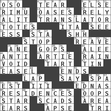 ACROSS 1. Bear (Spanish) 4. Separate forcefully 8. Otherwise 12. Tall New Zealand timber tree 14. Fertile tracts in a desert 16. Depend 17. Came down and settled, as after flight 18. Interpreter 20. Hauls 22. Call ___ day 23. Observe 24. Double-curved letter 25. R.R. building 28. Quiet! 30. Halt 31. Break or tear apart 35. One (Scot) 37. Republicans 40. Toward shelter 41. Against 42. Nick name for Arthur 44. Precipitation 45. Lacking any legal or binding force 46. Small pie 47. Shallow baking pan 48. Artist's stand 50. Extremities 52. Infant locale 54. Declare 55. Health resort 58. Eastern Standard Time (abbr.) 61. One more than two 63. Ferber et al. 65. Homes 70. I made a mistake 71. Play the lead 72. Tons 73. Type of rug 74. Hearing organs 75. Domed church section 76. Three (prefix) DOWN 1. Speak pompously 2. Grain storage towers 3. Leaves out 4. Small child 5. Hearing organ 6. White ___ sheet 7. Painter Guido (1575-1642) 8. Epoch 9. Allows 10. _ gin 11. Jane of fiction 13. Shoshoni 15. Fast planes 19. Cowardly lion portrayer 21. Fast jet (abbr.) 26. Ancient Roman robe 27. To the left, to Queeg 29. Centers 30. Beer mug 32. Mountain range southwest of Kyrgyzstan 33. Distinctive style or manner 34. Car or cant ending 35. Small Philippine buffalo 36. Nuclear Threat Initiatives 38. Parent Teacher Assoc. 39. Begets 41. "___ Maria" 43. Inactive volcano in Sicily 49. Put down 51. Color 53. Sliced desserts 55. Derisive sound 56. Some stationery 57. Slender Brazilian palm 58. Celtic language 59. Bristle 60. Russian ruler of old 62. South American Indian 64. ___ good deed 66. Big collection agency 67. Head covering 68. Begley and Asner 69. Compass dir.