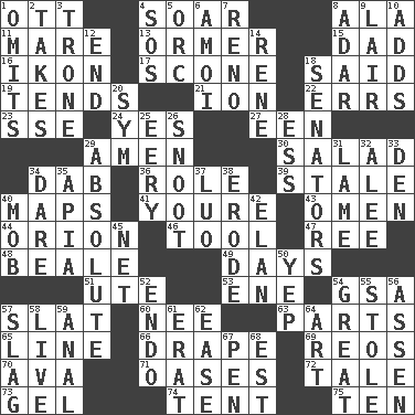 ACROSS 1. Baseball player Mel 4. Fly high 8. In the manner of 11. Female horse 13. Abalone 15. June honoree 16. Picture 17. Biscuitlike quick bread 18. Stated 19. Is inclined (to) 21. Electrically charged atom 22. Blunders 23. Compass dir. 24. It is so 27. Car or cant ending 29. So be it 30. Vegetable dish 34. Pat or tap gently 36. Hero or heavy, e.g. 39. Having lost freshness 40. Atlas contents 41. You are 43. Presage 44. Constellation of myth 46. Utensil 47. To riddle 48. Memphis, Tenn. Street 49. 24-hour periods 51. Shoshoni 53. Compass dir. 54. Girls' org. (abbr.) 57. Narrow board 60. Born 63. Actors' quests 65. Actor's bit 66. Window treatment 69. Vintage cars 70. Actress Gardner 71. Fertile tracts in a desert 72. Story 73. Set 74. Portable shelter 75. Nine, plus one DOWN 1. Leaves out 2. Proceeds 3. Marketplace scale 4. Mayday 5. The grampus (Milton) 6. Mine, in Marseilles 7. Former U.S. Attorney General Janet 8. The sixth month of the Jewish calendar 9. Den 10. Sums up 12. Conclusion 14. French philosopher Descartes 18. Elected representatives 20. Symbol (abbr.) 25. Suggestive of the supernatural 26. Snob 28. Curvy letter 29. Utter; complete 31. Unable to walk 32. Toward shelter 33. Lair 34. Have the gumption 35. Capital of Western Samoa 37. Nilotic language 38. Eat (away) 40. Disorderly crowd 42. Liveliness 45. Fish or hair follower 50. Slangy assent 52. Inside; within (prefix) 54. Relatively large 55. Took without asking 56. NE Netherlands city 57. Volcanic refuse 58. Moving, as bait 59. Of or related to the anus 61. Part of Q.E.F. 62. Comfort 64. Nonscientific branch of learning 67. Writing instrument 68. Eastern Standard Time (abbr.)