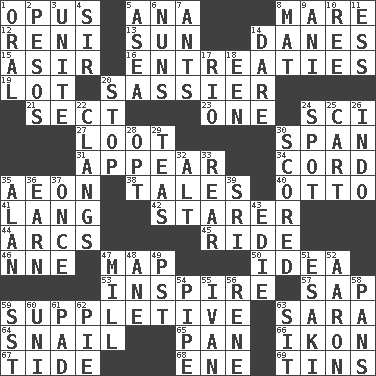 ACROSS 1. Musical composition 5. Santa ___, CA 8. Female horse 12. Painter Guido (1575-1642) 13. Player for Phoenix 14. Natives or inhabitants of Denmark 15. SW Saudi Arabia district 16. Pleas 19. Car dealer's back yard 20. More disrespectful 21. Religious group 23. Single 24. _-fi 27. Spoils 30. Connect, as a bridge 31. Become visible 34. Drawstring 35. Age 38. Falsehoods 40. "Beetle Bailey" pooch 41. Long (Scottish) 42. A viewer who gazes fixedly 44. Curves 45. Travel on an animal 46. Compass dir. 47. Atlas unit 50. The content of cognition 53. Motivate 57. Plant excrement 59. Supplying deficiencies 63. "Two Mules for Sister ____" 64. Slow-paced one 65. Baking dish 66. Visual representation of an object 67. Event that recurs at intervals 68. Compass dir. 69. Metal containers DOWN 1. Of the mouth 2. Mexican monetary units 3. Join together 4. Title for a knight 5. At sea 6. Religious women 7. Pismires 8. Floor protector 9. Cuckoo 10. Portuguese money of account (variant) 11. Curvy letter 14. Have the gumption 17. River (Sp.) 18. Car or cant ending 20. Cease 22. Rings like a ship's bell 24. Blemish 25. Heavy open wagon 26. Southeast Asian peninsula 28. Choose 29. Afternoon social gatherings 30. Tallied 32. The first octave above the treble staff 33. Tail end 35. Actor Alda or Thicke 36. Merit 37. Single time 39. Indian title of respect (Mr.) 43. Singer Brickell 47. Place where flour is made 48. A saturated hydrocarbon 49. Pacific Standard Time (abbr.) 51. 1973 Nobel Price Winner (Physics) Leo 52. Composer Copland 54. Corncob 55. _ the terrible 56. French philosopher Descartes 58. Baking dishes 59. Fast jet (abbr.) 60. Single; one (prefix) 61. Groovy apt. 62. Sliced dessert 63. Be seated