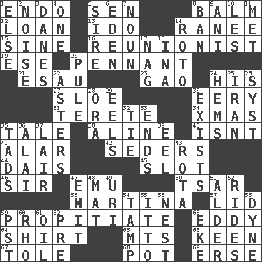 ACROSS 1. Inside; within (prefix) 5. Elected rep. 8. Lip ointment 12. Grant temporary use of 13. Wedding promise 14. Indian princess (variant) 15. Trig term 16. One who advocates reunion 19. Compass dir. 20. Pre-World Series prize 21. He sold his birthright 23. E Mali city 24. Part of HMS, perhaps 27. _ gin 30. Suggestive of the supernatural 31. Cigar-shaped 34. Dec. holiday 35. Lie 38. Place in a line 40. Is not 41. Having or resembling wings 42. Spring feasts 44. Raised platform 45. Narrow, elongated depression 46. Title for a knight 47. Australian flightless bird 50. Russian ruler of old 53. Chrissie's court nemesis 57. Flaplike covering 59. Appease 63. Whirlpool 64. Chest covering 65. Mountains (abbr.) 66. Peachy ____! 67. Lacquered or enameled metalware 68. Plant holder 69. Celtic language DOWN 1. Otherwise 2. Annoying sound 3. Natives or inhabitants of Denmark 4. Single 5. Father 6. Locale of original sin 7. Part of speech 8. Bar 9. Black tropical American cuckoo 10. French article 11. Was introduced to 14. Printing process, for short 17. Tired old horse 18. _ tizzy (2 wds.) 20. Whine 22. Michaelmas daisies 24. Folds over and sews together 25. SW Asia republic 26. System (abbr.) 28. Mouth or opening 29. Snakelike fish 30. Is 32. Make a knot 33. Conclusions 35. Small boys 36. Mountain range southwest of Kyrgyzstan 37. Den 39. Snakelike fish 43. Round or rotation of duties 47. Send forth 48. Floor protector 49. RI univ. 51. Tree or shrub in the Birch family 52. Amusement-park features 54. Pack (down) 55. "Tell ____ the Marines!" 56. A home for chicks 58. Unit of force 59. Pacific Standard Time (abbr.) 60. 17th letter of the Greek alphabet 61. Lubricate 62. Before (prefix) 63. Supplement with great effort