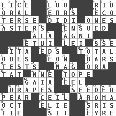 ACROSS 1. Louse (plural) 5. Nilotic language 8. To free from 11. Taken by mouth 12. Blunders 14. Environmental prefix 15. Laconic 17. "You Light Up My Life" star Conn 18. Washington bills 19. Michaelmas daisies 21. Followed as a consequence or result 23. Wing 25. Hindu god of fire 26. Needle case 27. Flowery wreath 28. Compass dir. 31. Call ___ day 33. Begley and Asner 35. Add up to 37. Lyric poems 38. Age 40. Oblong pieces of solid material 41. Trials 43. Tired old horse 45. Mouth or opening 46. Make lace 47. Compass dir. 50. Drink excessively 52. Greek goddess of the earth (variant) 53. Snakelike fish 54. Window treatments 56. Sowing specialist 61. Lightbulb-shaped fruit 62. To provide with a ceiling 65. Odor 66. Sep. follower 67. Writer Wiesel 68. Indian titles of respect 69. Standoff 70. Be seated 71. Jane of fiction DOWN 1. Globular water bottle used in Asia 2. Angers 3. Haul 4. Otherwise 5. Directed 6. RI univ. 7. Severe or trying experience 8. French philosopher Descartes 9. On the rocks 10. Two (Sp.) 13. Burn superficially 16. Part of Q.E.F. 18. Fr. "Yes" 20. Change direction abruptly 22. In a ____ (agitated or irritated) 24. Helper 26. Compass direction 28. Play the lead 29. "Two Mules for Sister ____" 30. Raised railways 31. The content of cognition 32. Trial 34. Male child 36. Mitch Miller's instrument 37. Baseball player Mel 39. Nathan's nickname 42. Fastener 44. Moves 48. Sibling's daughter 49. Artist's stands 51. Entreaty 52. Slender fish 54. Tenth: prefix 55. Pace 57. Celtic language 58. Dinghy 59. Arab leader 60. Raze (variant) 61. Plant holder 63. One more than two 64. Allow